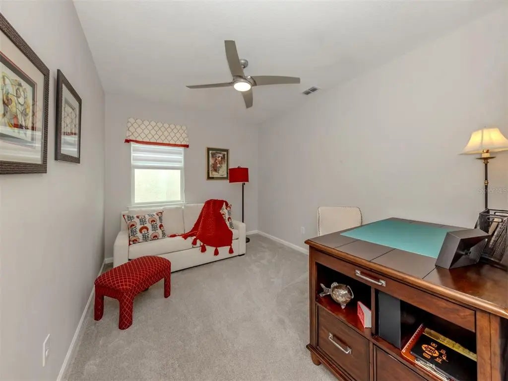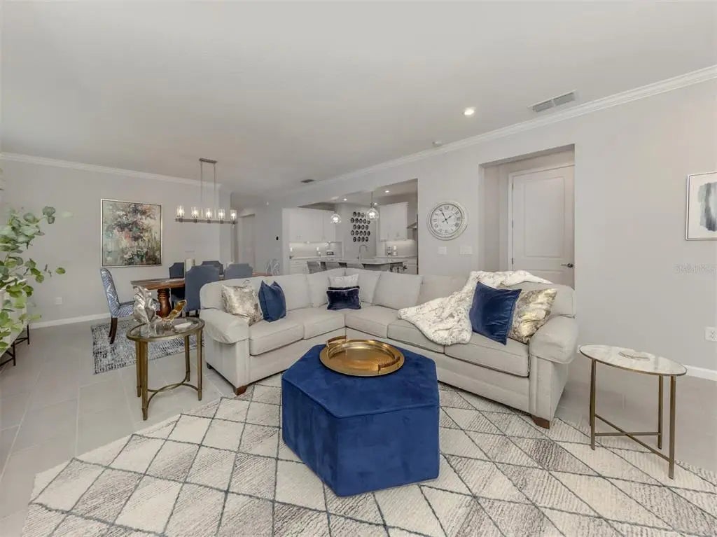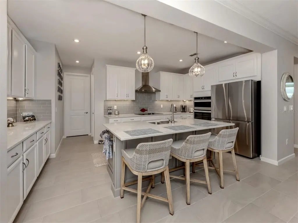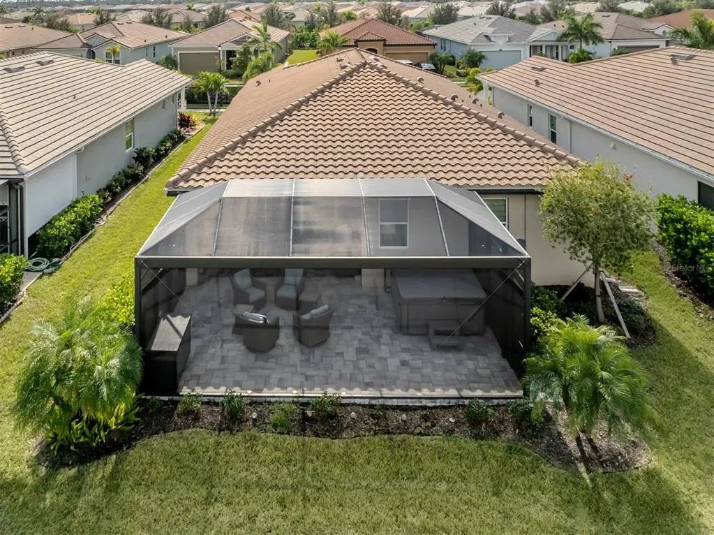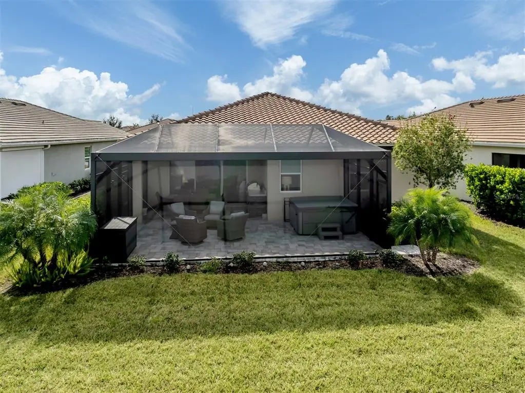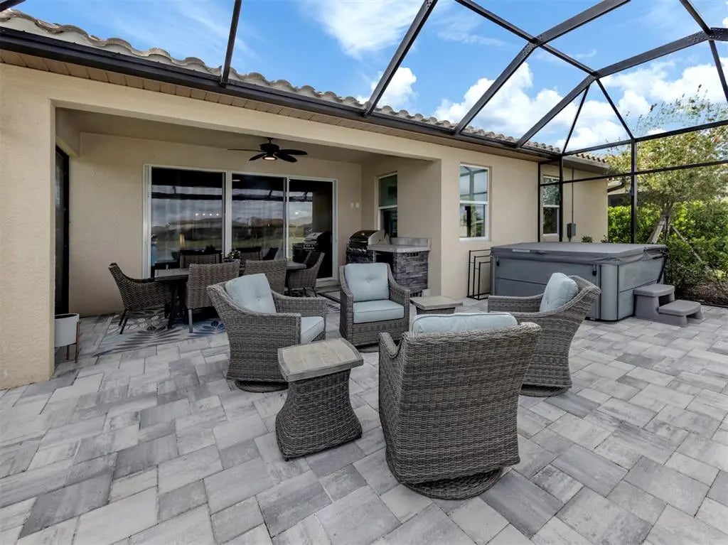 Under contract-accepting backup offers. This sun-lit, meticulously cared-for home offers both style and serenity, with premium upgrades and breathtaking water views. Impeccably maintained Antigua II model, offering 2,182 square feet of bright, sun-filled living space in the highly sought-after gated community of Renaissance at Wellen Park. Featuring 3 bedrooms, 2 full baths, den/flex room, and a 2-car garage, this great-room-style home blends comfort, elegance, and modern design. Step inside through the beautiful glass entry door into a spacious foyer, setting the tone for the refined interior. Tile flooring flows throughout the main living areas, enhancing the home's open and airy feel. At the heart of the home is the expansive chef's kitchen, complete with solid wood cabinetry, quartz countertops, wall oven, built-in cooktop, breakfast bar, and a large custom walk-in pantry offering an abundance of extra storage. The kitchen seamlessly connects to the dining area and great room, making entertaining effortless. The great room features a custom built-in electric fireplace and wide sliding glass doors that open to the oversized lanai. The owner's suite, located at the rear, creates a private oasis and includes a spacious walk-in closet with custom built-in shelving, a linen closet, and a luxurious en suite featuring dual sinks, solid wood cabinetry, quartz countertops, an oversized glass walk-in shower, and a private water closet a true retreat. The two well-appointed guest bedrooms are located on the front of the home and near the second full bath and include plenty of privacy and space for family or guests. The laundry room, conveniently located off the kitchen, includes a utility sink and custom built-in space for the washer and dryer. Out back, discover your private oasis with an extended lanai overlooking long, tranquil water views enhanced by a clear-view screen. The custom outdoor kitchen with Bull appliances and a large hot tub creates the perfect space to unwind after a day at the beach or clubhouse. Behind its gates, the Renaissance community includes a resort-style heated pool, spa, tennis and pickleball courts, bocce, a fitness center, playground, and more. The nearby nature trails lead to the Blue Heron Park. The low monthly fees cover ground maintenance and all amenities. Near the Atlanta Braves spring training ballpark, downtown Wellen Park, Costco, dining, shopping, medical facilities, U.S. 41, Interstate 75 and pristine beaches of the beautiful Gulf! **See FEMA LOMR in MLS - NO FLOOD INSURANCE REQUIRED***