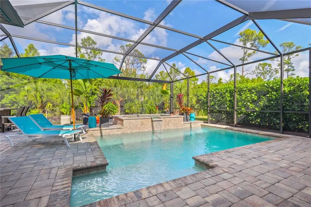 Welcome to this stunning Sam Rodgers built Napoli executive style home located in the community of Gran Paradiso, Wellen Park Florida. This home is richly appointed with custom upgrades throughout. Light, bright, and airy, the residence features soaring cathedral ceilings and a fresh, modern color palette. Smart-home technology seamlessly controls the outdoor storm shutters, pool and spa, color-changing lighting, and interior temperature for effortless comfort. The spacious primary suite offers a serene retreat complete with a luxurious bath featuring a garden tub and a beautifully designed tech closet. The chef’s kitchen is a true showpiece, boasting custom wood cabinetry, quartz countertops, a convection oven, and a striking herringbone tile accent wall. Outdoor living is exceptional in this home. Step outside to an expansive brick-paver lanai showcasing a sparkling salt water pool and spa with a waterfall feature, along with a full outdoor kitchen—perfect for entertaining or simply relaxing in your private oasis. All this, combined with quality craftsmanship and thoughtful design, makes this home an extraordinary opportunity. Please see attachments for all upgrades like for example the tankless water heater, EV garage charging station and more. Sellers are also providing 1 full year of American Home Shield Warranty!