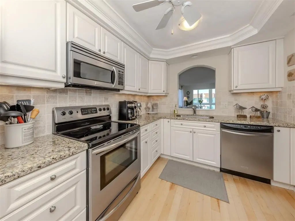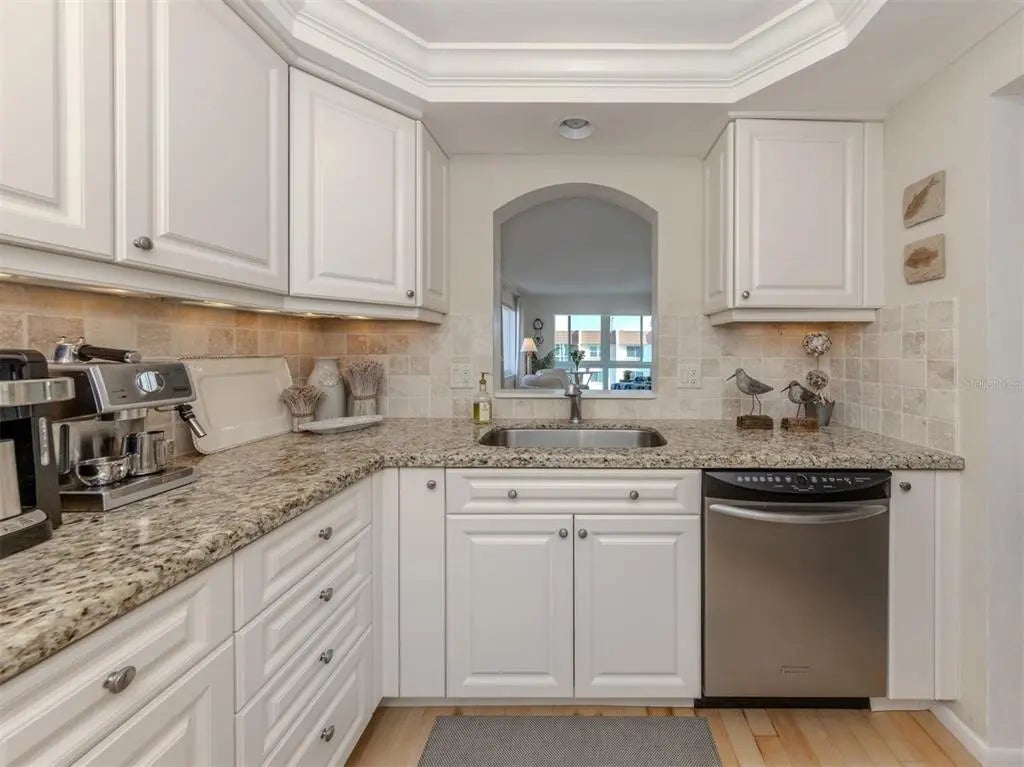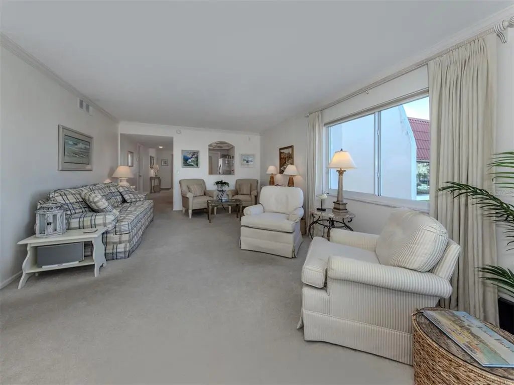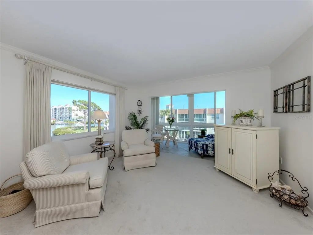 Experience coastal living at its finest in this beautifully updated end-unit residence, showcasing serene water views. In meticulous condition throughout. Nestled within the exclusive and sought-after Bella Costa community on Venice Island, this spacious 2-bedroom, 2-bath condominium offers exceptional comfort and style in one of the area’s most desirable locations. Step inside to a bright, inviting separate dining area. Adjacent find the well-sized kitchen featuring stainless steel appliances, granite countertops, and premium cabinetry overlooking the spacious living room, a great room to entertain and enjoy the wonderful Harbor Bay views. This generous living area flows seamlessly into an enclosed lanai, enhanced by floor-to-ceiling impact-resistant windows that frame lush garden scenery and the vibrant Intracoastal Waterway, perfect for relaxing or entertaining. Elegant plantation shutters and tasteful draperies elevate the home’s coastal sophistication, while the end-unit placement ensures added privacy and natural light. Bella Costa residents enjoy an unbeatable downtown lifestyle, located just steps from the Venice Theatre, charming boutiques, top-rated restaurants, and a short bike ride to Venice’s pristine beaches. With completed structural engineering and strong financials, Bella Costa offers peace of mind and long-term stability. This is an exceptional opportunity to own a move-in-ready waterfront retreat in the heart of Venice Island. Furniture included and most other items to be left as a courtesy to the buyer. Schedule your showing today and make this beautiful place your own.