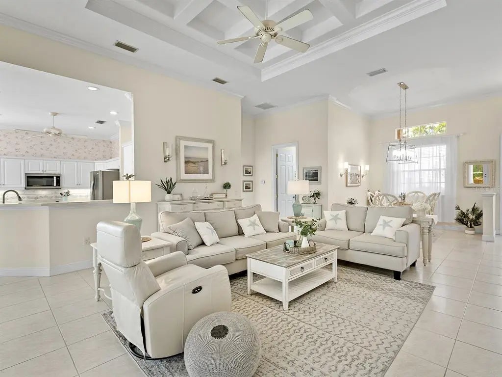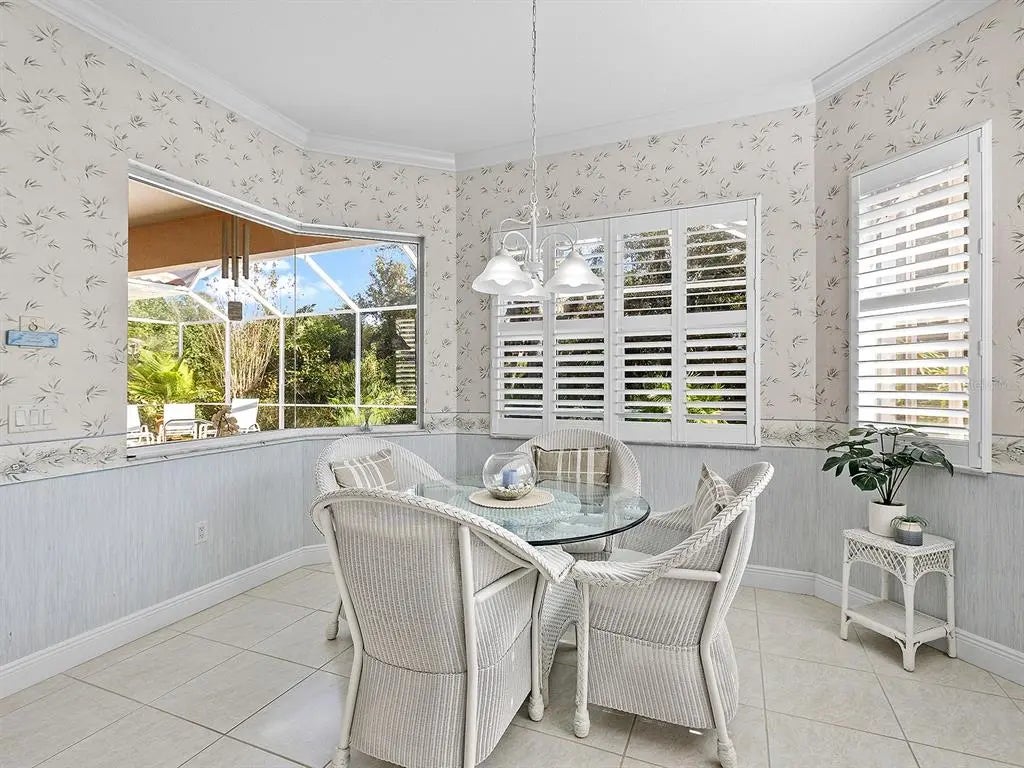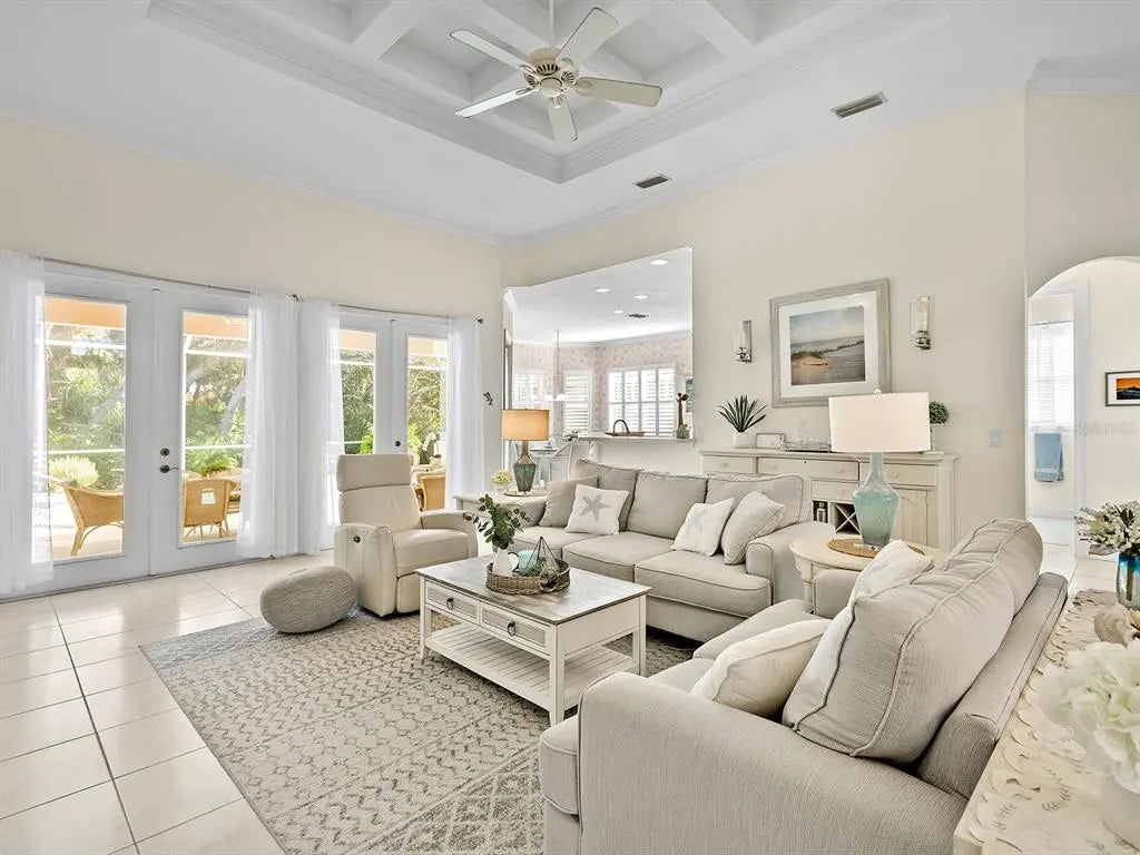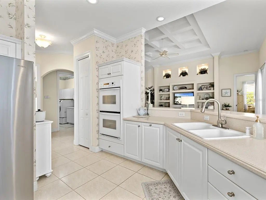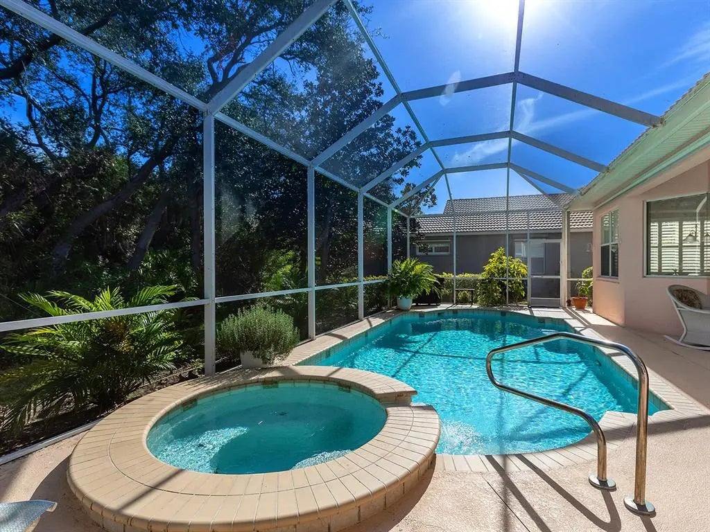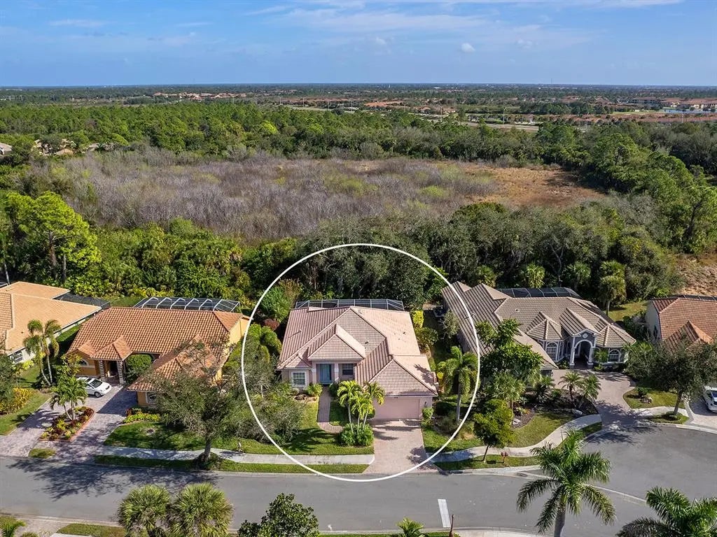 Welcome to this elegant residence located in the sought-after gated community of Venetia in Venice, Florida. Positioned on a private preserve lot, this three-bedroom, two-bath home offers 2,129 square feet of living space designed for comfort and refined living. The bright and open floor plan is accentuated by vaulted ceilings, coffered architectural details and an abundance of natural light throughout the main living areas. The spacious kitchen features a built-in double oven, generous pantry space, bar seating and an expansive dinette area framed by aquarium windows overlooking the pool and preserve. The living room is anchored by custom built-ins and high coffered ceilings, complemented by two sets of French doors leading to the outdoor living area. A separate dining room provides additional space for entertaining, enhanced by a large front-facing window. The primary suite includes private access to the lanai, two walk-in closets and an en-suite bath with dual vanities, soaking tub and a separate shower. Tile flooring runs throughout the main living areas, with crown molding and neutral tones that create a serene atmosphere. Outdoor living is equally impressive, with a covered lanai, extended patio area for grilling or lounging and a screened pool with spa, all set against the backdrop of a tranquil preserve. Additional features include an indoor laundry room, two-car garage and an X flood zone location, which means no flood insurance is required. Conveniently near downtown Venice, with proximity to shopping, dining and Gulf Coast beaches.