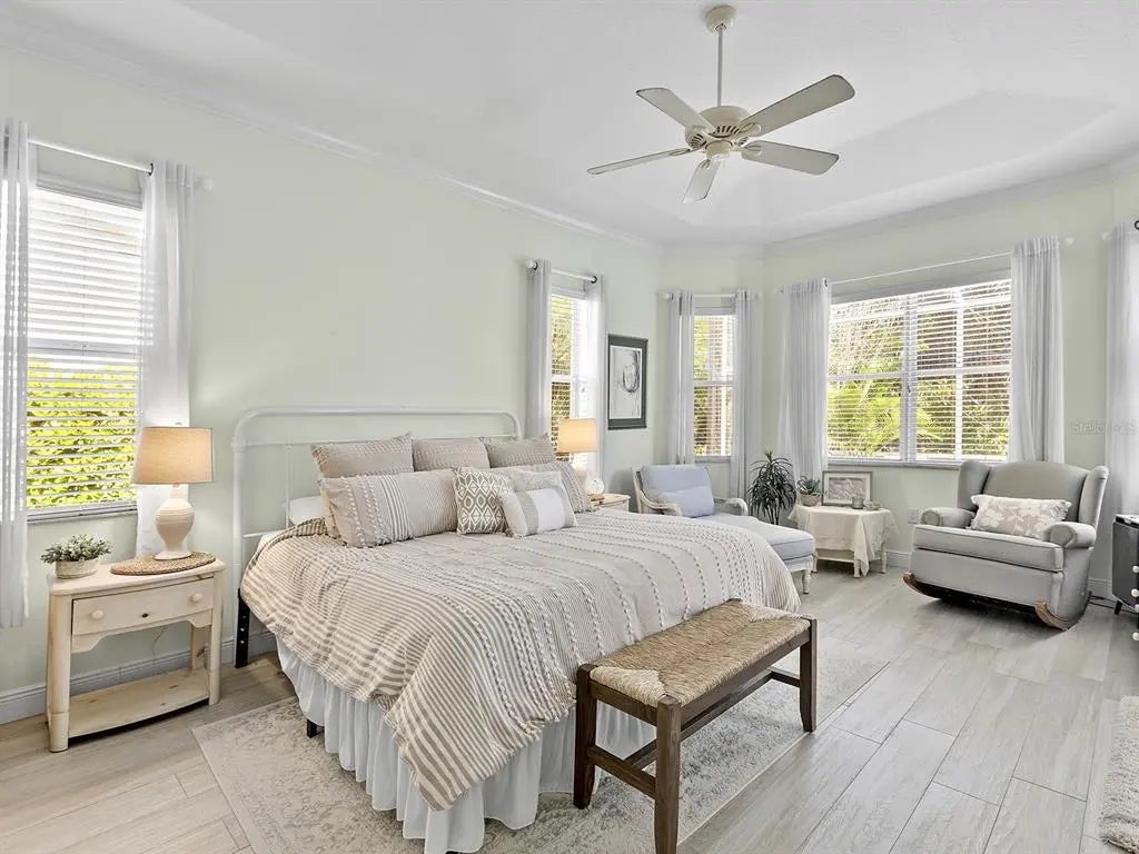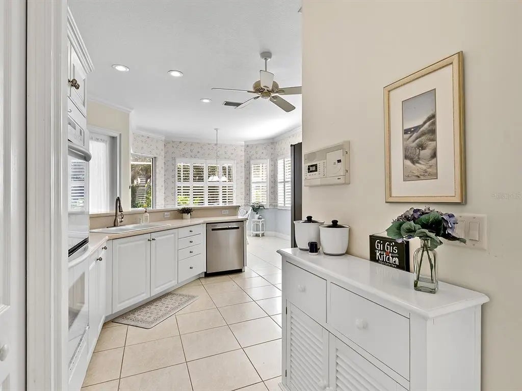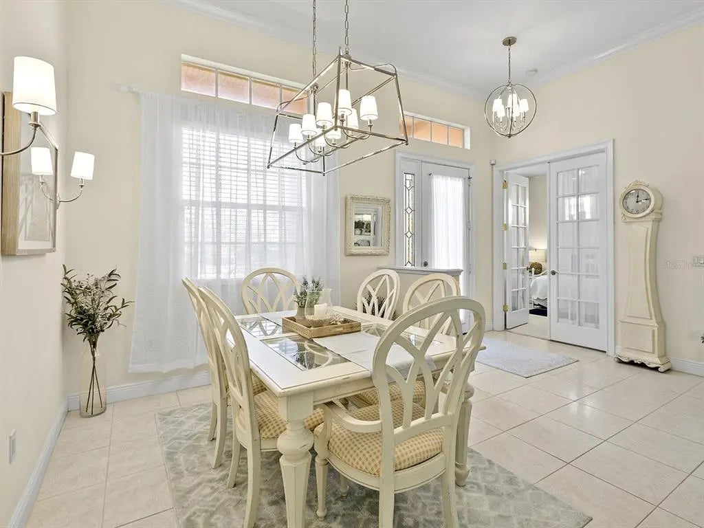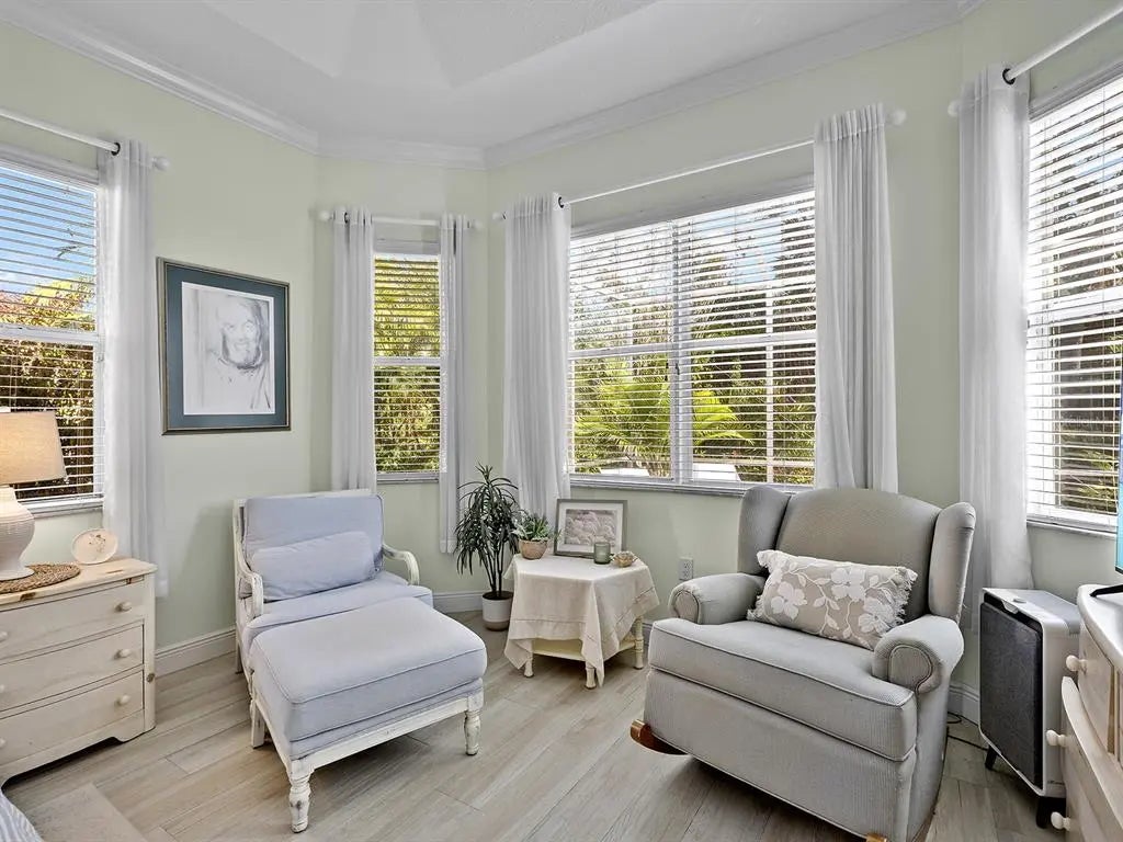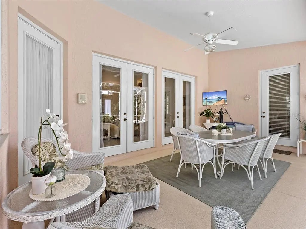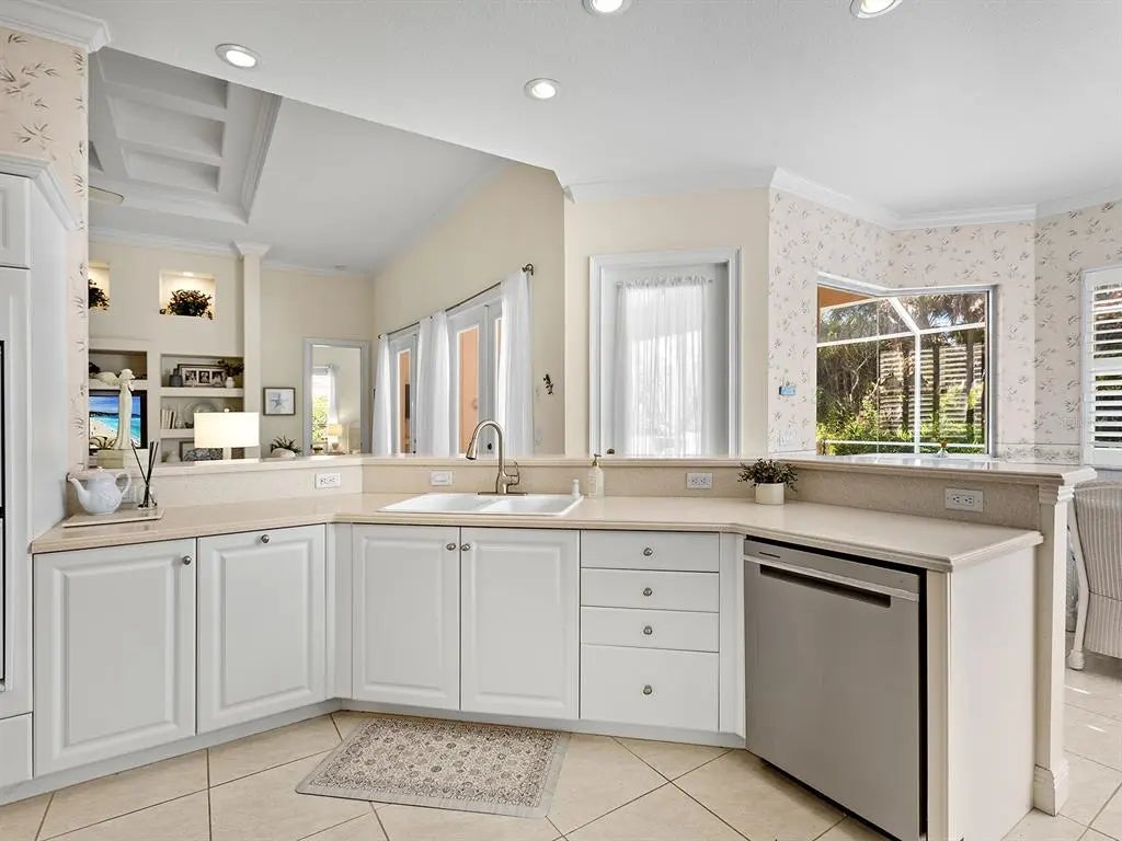 Welcome to this elegant residence located in the sought-after gated community of Venetia in Venice, Florida. Positioned on a private preserve lot, this three-bedroom, two-bath home offers 2,129 square feet of living space designed for comfort and refined living. The bright and open floor plan is accentuated by vaulted ceilings, coffered architectural details and an abundance of natural light throughout the main living areas. The spacious kitchen features a built-in double oven, generous pantry space, bar seating and an expansive dinette area framed by aquarium windows overlooking the pool and preserve. The living room is anchored by custom built-ins and high coffered ceilings, complemented by two sets of French doors leading to the outdoor living area. A separate dining room provides additional space for entertaining, enhanced by a large front-facing window. The primary suite includes private access to the lanai, two walk-in closets and an en-suite bath with dual vanities, soaking tub and a separate shower. Tile flooring runs throughout the main living areas, with crown molding and neutral tones that create a serene atmosphere. Outdoor living is equally impressive, with a covered lanai, extended patio area for grilling or lounging and a screened pool with spa, all set against the backdrop of a tranquil preserve. Additional features include an indoor laundry room, two-car garage and an X flood zone location, which means no flood insurance is required. Conveniently near downtown Venice, with proximity to shopping, dining and Gulf Coast beaches.