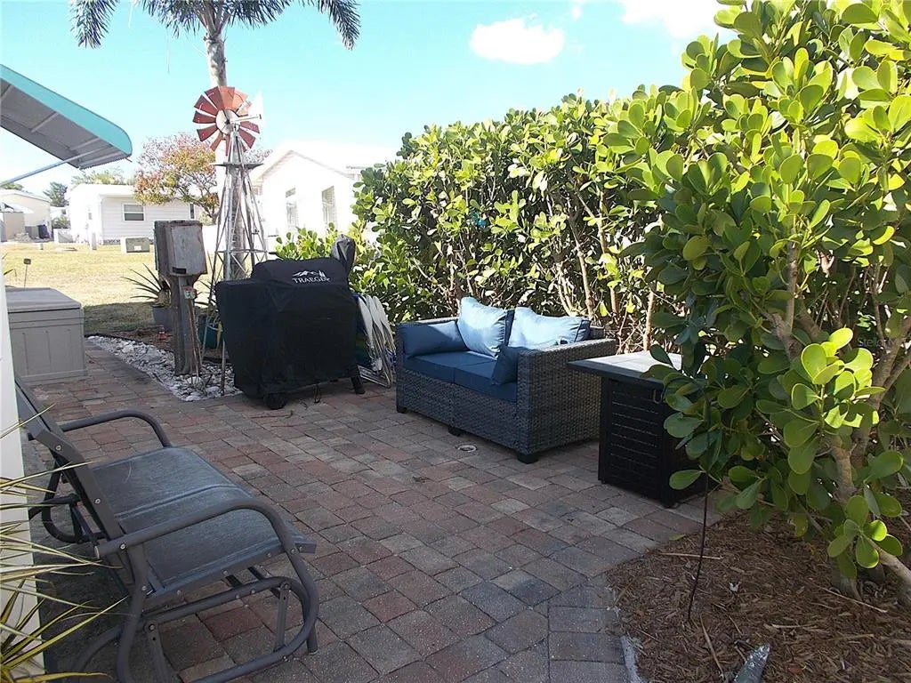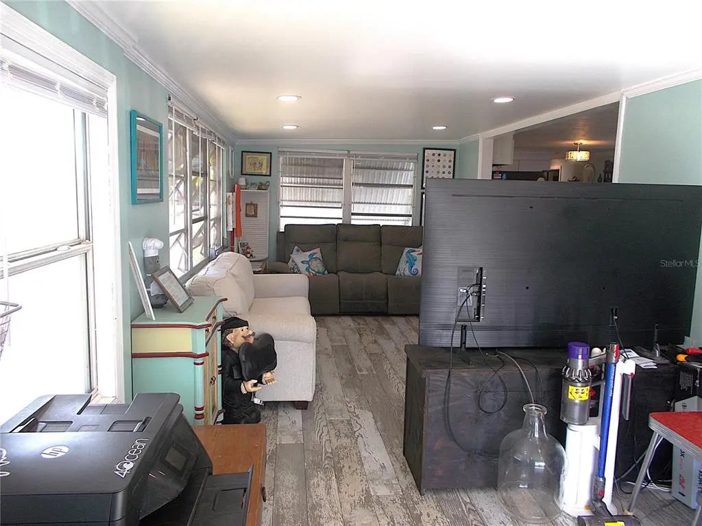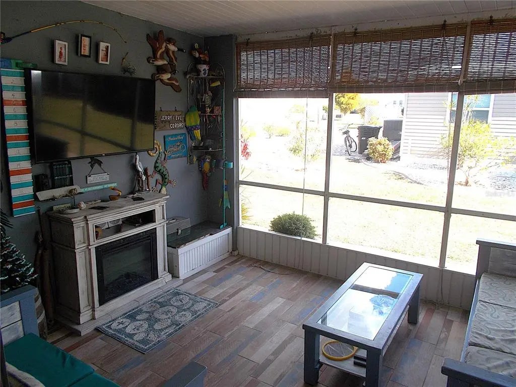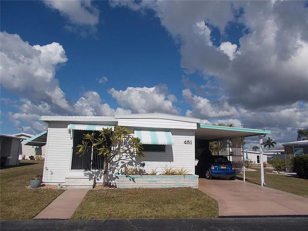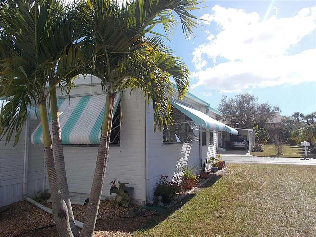 Your "new" beach cottage awaits!! This remarkable 2 bedroom, 2 bath furnished mobile has so many extras and "new", you'll be able to start enjoying your slice of FL paradise immediately! New/newer of mention include, but not limited to: BRAND NEW ROOF (Jan 2026), electric panel, a/c & ductwork, most windows, subfloors and floor coverings, both bathrooms and kitchen, all appliances, crown molding and tile backsplash. Enter through the screened lanai, complete with electric fireplace for those not-so-warm evenings, with ceramic tile flooring. Enter your living quarters through the sliding glass door into your remodeled kitchen with stainless appliances (including a dishwasher) and an island which is open to the dining area with built-in display cabinetry. The enormous 26x10 living room allows plenty of room for entertaining and perhaps an office or hobby area. This popular split-bedroom floor plan allows privacy with bedrooms at either end of the mobile and full baths adjacent to both bedrooms. The primary bathroom is completely remodeled with dual sinks and has a fully tiled walk-in shower, while the guest bathroom is also completely remodeled with a shower/tub combo. You don't have to walk outside to do your laundry here! The large laundry room with full size washer and dryer also has numerous shelves for storage and an additional refrigerator! Needing more storage space? We got you! You'll find 2 more large sheds - one found off of the laundry room and another at the back of the home. Relax out on the private paver brick patio after showering off at your outside "surfboard" shower after a day at one of the nearby gorgeous beaches. Sandalwood Park is renowned for it's low quarterly fees, large lot sizes, being pet friendly, fabulous location and numerous activities. Don't miss out on this fantastic opportunity to become one of Sandalwood Park's newest residents! Make your appointment to see this very well appointed mobile today!
