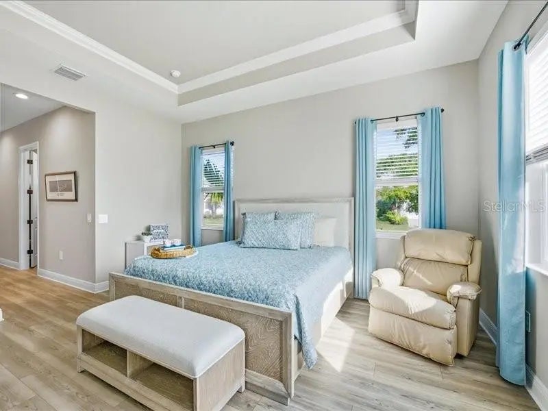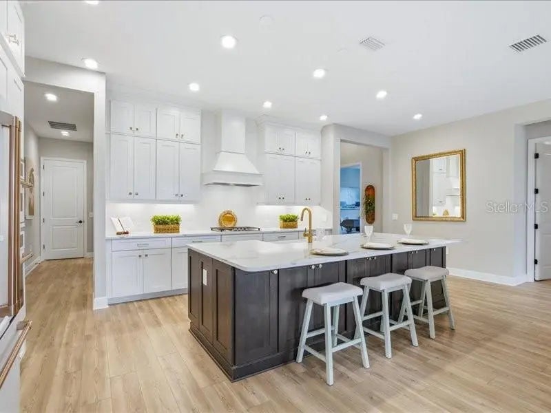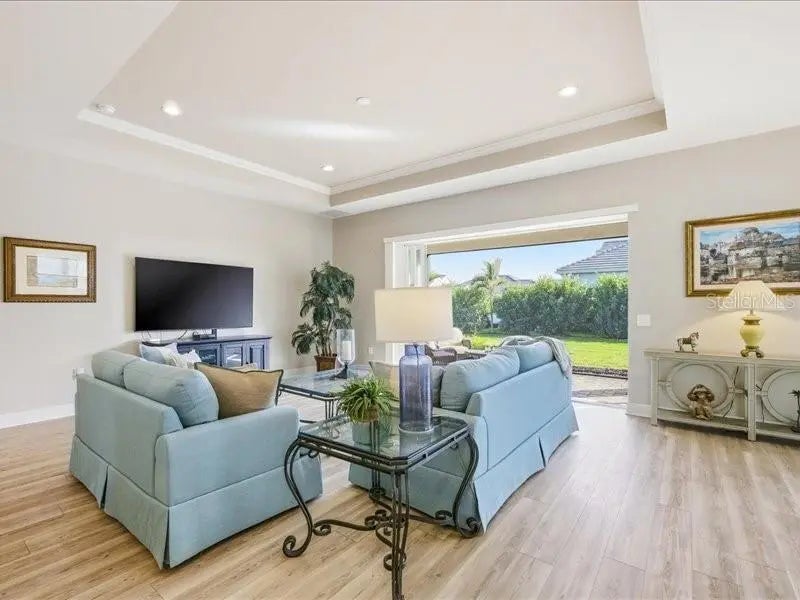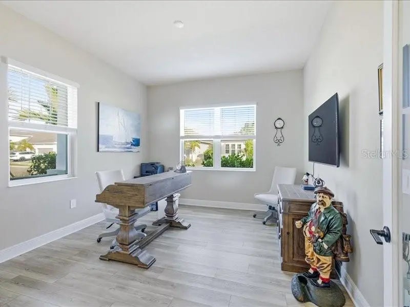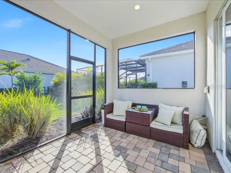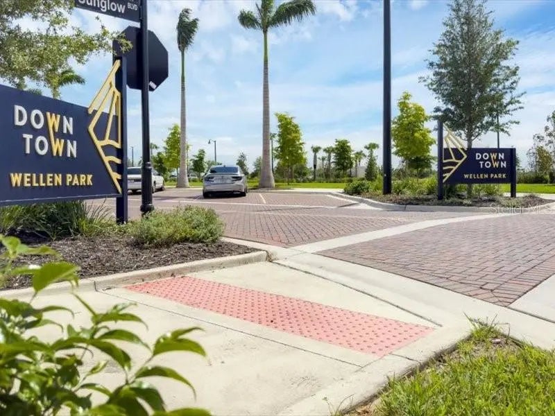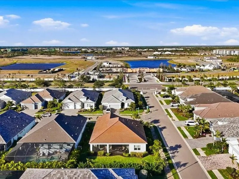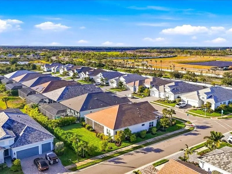 Welcome home to easy, comfortable living in **Avelina at Wellen Park**, a small, gated neighborhood of just 96 homes built by Neal Communities, known for its sidewalks, mature landscaping, and relaxed, friendly feel. This 3 bedroom, 2 bath home with a flex room sits on a corner lot with a south-facing backyard, offering great natural light and room to add a pool if you wish. From the welcoming front porch, step into a front foyer to see the tall ceilings, tall doors, and neutral tones that make this home feel open, spacious and inviting. The split floor plan offers privacy, with the primary suite tucked away on one side of the home and two guest bedrooms on the other. The heart of the home is the open kitchen, great room, and dining area, designed for everyday comfort and easy entertaining. The kitchen is a standout with designer quartz countertops, a farm-style sink, decorative vented hood, and Café brand matte white appliances with fashionable bronze and copper accents. You’ll appreciate the natural gas 5-burner stove, wall microwave above the wall oven with WiFi, huge island with casual seating for 5–6, walk-in pantry, under-cabinet lighting, and abundant drawer and cabinet storage. The kitchen flows seamlessly into the spacious great room and dining room, both filled with natural light. Quadruple sliding glass doors in the great room stack out of the way, and triple sliders in the dining room, open to the paver lanai for the indoor/outdoor lifestyle Florida living is all about. Quality Hunter Douglas pull-across accordion sun shades add comfort and style. The lanai is already equipped with outdoor kitchen hookups - ready for you to create the setup that fits your lifestyle. The primary suite is a peaceful retreat with a coffered ceiling, great light, and two large walk-in closets. The en-suite bath features a large walk-in shower with a high window for light yet privacy, dual vanity, separate water closet. Two guest bedrooms are comfortably sized and share a guest bath with a tub/shower combo and linen closet. The laundry room, located near the guest rooms, includes the washer and dryer with upper cabinets, a sink, and shelving for extra storage. Additional highlights include quality LVT (Luxury Vinyl Tile) plank flooring in common areas and primary bedroom for ease of care, tile in bathrooms and carpet in bedrooms two and three, 5.25-inch baseboards, matte black hardware throughout, and a 2-car plus golf cart garage with epoxy floors and a natural gas water heater. The driveway, walkway, and lanai are finished with pavers. All glass is impact for ease and peace of mind. Avelina is a quiet, intimate Wellen Park neighborhood, where the HOA maintains and irrigates the landscaping, making everyday living easy. Enjoy the ability to walk to the Publix plaza, attend events at CoolToday Park (Atlanta Braves Spring Training), or take a short bike or golf cart ride to downtown Wellen Park for dining, shopping, and the regularly scheduled entertainment. A thoughtfully designed home in a rare, small Neal Communities neighborhood—this one may truly check all the boxes for you.