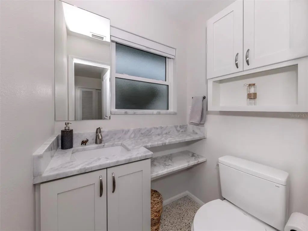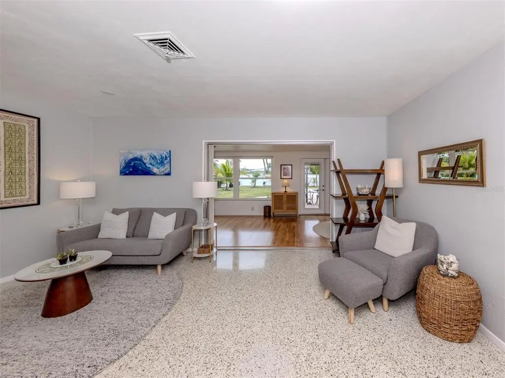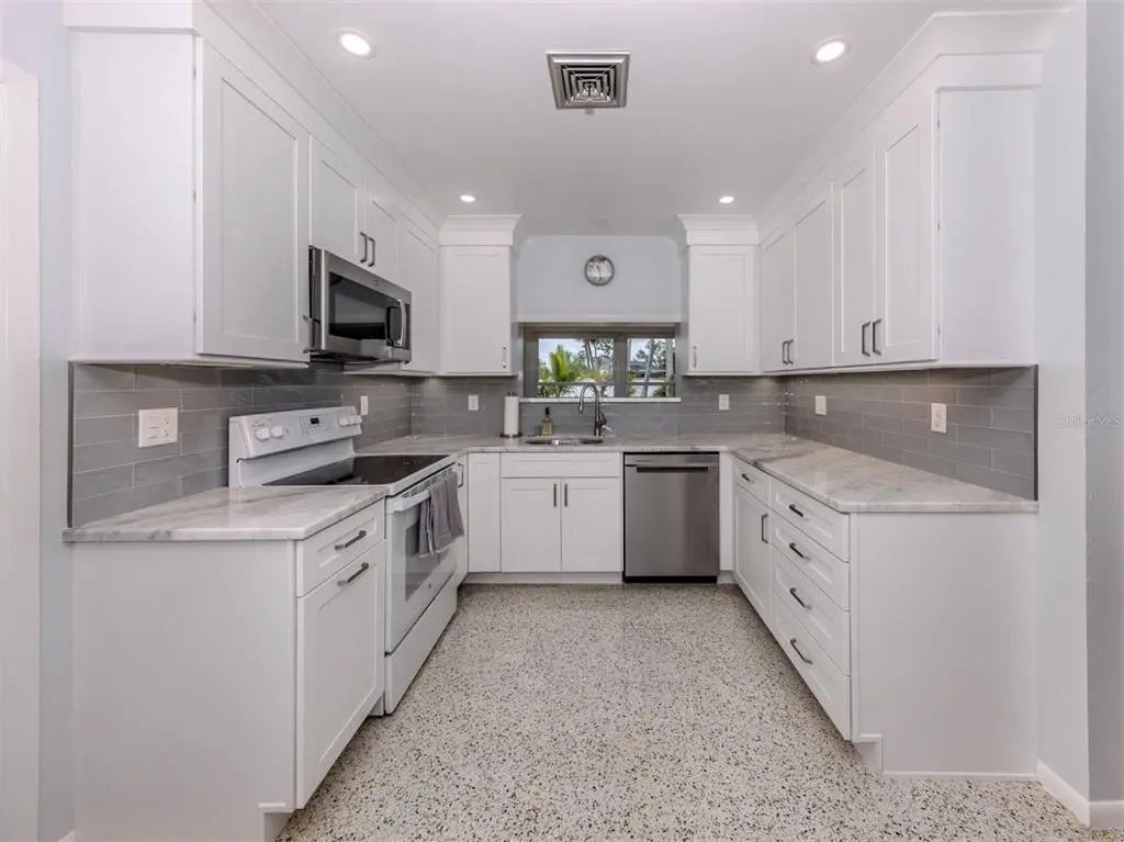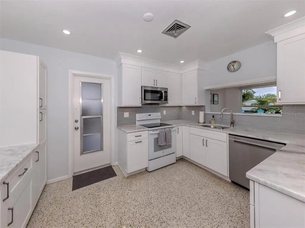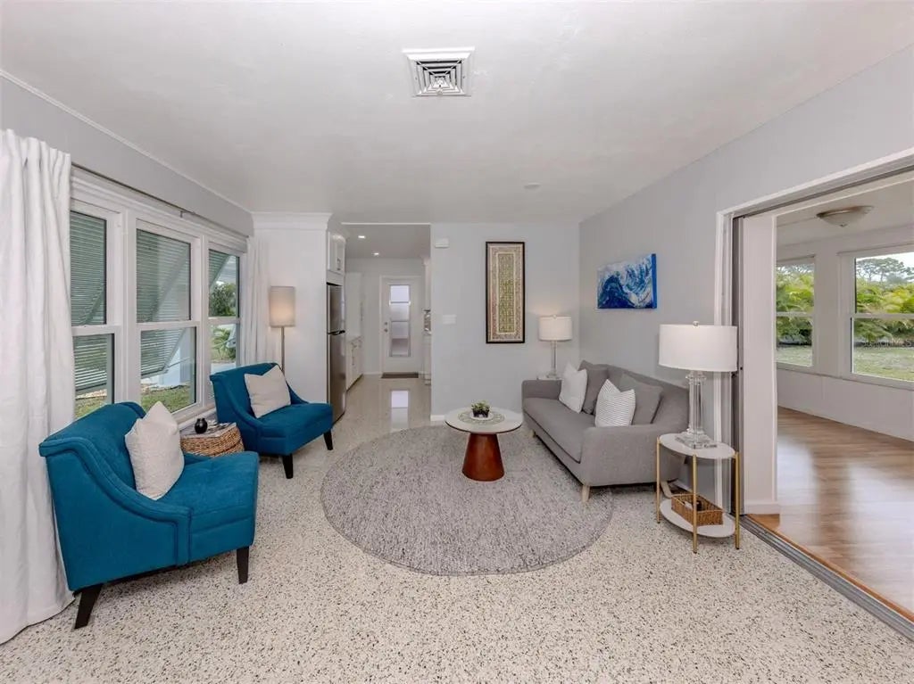 To see it is to love it! You'll be amazed by this Venice Island fully renovated mid-century home, from perfected terrazzo floors, the large contemporary kitchen, open Florida room, the sleek, updated baths, and beautiful private pool and back yard. Located is approx 6 blocks to downtown and 5 blocks to the beach! The list of thoughtful updates is extensive. In the kitchen you'll notice soft-close extra-height cabinetry, a recent suite of appliances, stainless sink that's integrated into the white stone countertops and open pass-thru to the Florida room. Bedrooms are on opposite ends of the house, with amazingly updated bath in between and equally luxurious half bath in the primary bedroom. You'll feel drawn to the large free-form pool, pergola-style patio, tropical plantings and privacy fence enclosing both sides and the back of the property. And beyond just looking good, the roof and AC were recently replaced, house re-piped in 2024, exterior freshly painted in 2026 and windows and most doors are impact rated. The 8x12 combination laundry and workshop just off the carport serves well for extra storage space too. The property is in FEMA X zone, for lowest flood risk. It's classic Venice vintage with modern functional flair. Please plan to see this treasure in person soon!