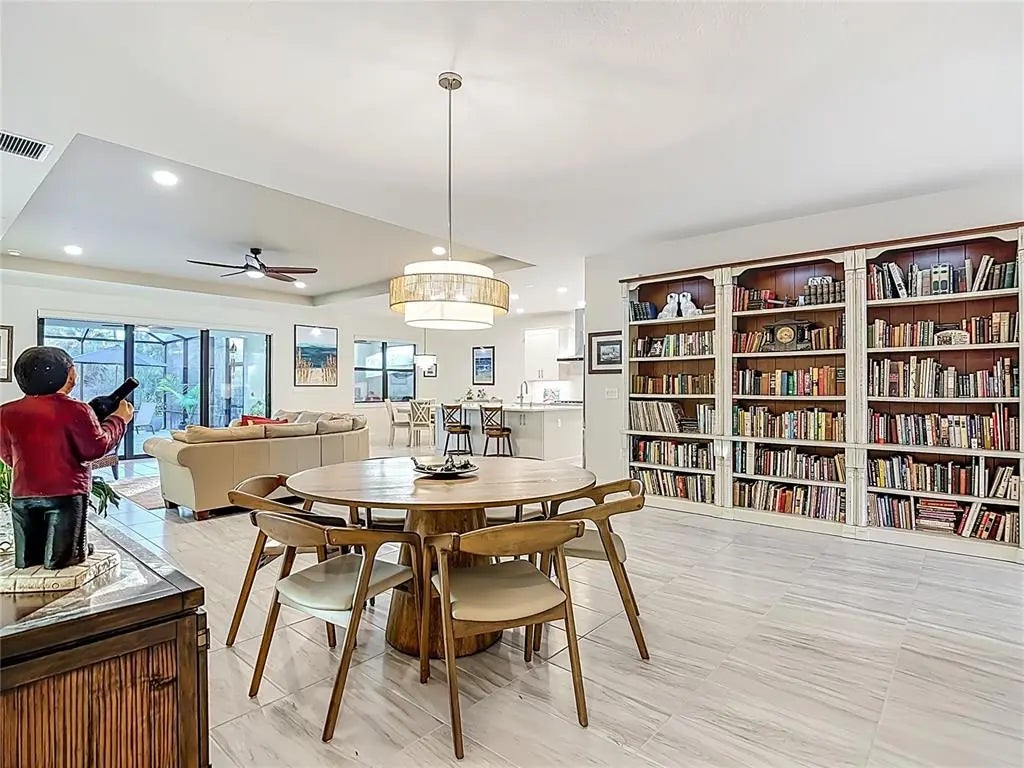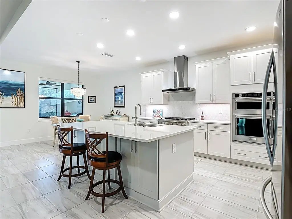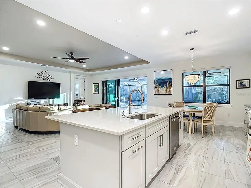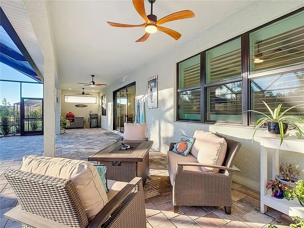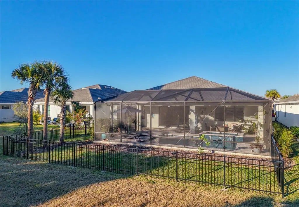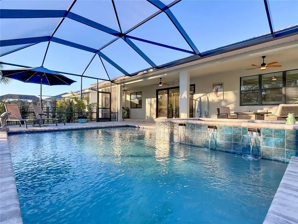 Under contract-accepting backup offers. UNDER CONTRACT - ACCEPTING BACK UP OFFERS - Welcome to an exceptional expression of refined Florida living within the exclusive, gated enclave of Solstice at Wellen Park. Crafted by luxury builder Toll Brothers, this impeccably appointed residence offers 2,591 square feet of luxurious living space where thoughtful design, quality craftsmanship, and timeless elegance converge. The home features three generously sized bedrooms, a versatile den framed for doors to allow a true four-bedroom option, two-and-a-half beautifully appointed baths, and a full three-car garage with epoxy flooring. From the moment you enter, elegant all-tile flooring throughout (no carpet) creates a cohesive, contemporary aesthetic. At the heart of the home is a striking chef’s kitchen featuring crisp cabinetry, quartz countertops with waterfall quartz backsplash, and a large statement island with front-facing storage. The upgraded appliance suite includes a six-burner natural gas range with stainless-steel vent hood, LG French-door refrigerator, and built-in wall oven - ideal for both entertaining and everyday living. Pull-out shelving in lower cabinets and custom walk-in pantry enhance both function and presentation. The living room and breakfast nook have motorized window shades for effortless light and privacy control, while the high-end laundry room blends form and function with added cabinetry, utility sink, upgraded front-load washer and gas-powered dryer with pedestal bases. The home also includes a natural gas tankless hot water heater for efficient, on-demand hot water. The primary suite offers a serene retreat with plantation shutters, tray ceiling, and a spa-inspired en suite bath featuring a frameless glass walk-in shower, split double vanities, and an expansive walk-in closet with custom-built storage. Outdoor living truly shines - A heated saltwater pool is paired with an oversized spa featuring a dramatic waterfall 'scupper' and LED color-changing lighting. The expansive covered patio spans approx. 50 feet and includes three elegant ceiling fans, providing exceptional comfort and shade. A privacy screen creates an intimate outdoor lounge, and the space is pre-plumbed for a future outdoor kitchen. Beyond the enclosure, peaceful preserve and pond views provide a tranquil backdrop, while a fully fenced yard adds convenience for pets. Built for peace of mind, the home includes a tile roof, hurricane-impact windows and doors, is located outside the flood zone, and is pre-piped for a future whole-house natural gas generator. Reasonable community fees provide access to a resort-style pool, fitness center, pickleball, clubhouse, lawn care, irrigation, annual mulch, and internet with basic cable - supporting a low-maintenance, luxury lifestyle. Ideally positioned for both privacy and proximity, Wellen Park offers golf-cart-friendly living, upscale shopping and dining, scenic trails around Grand Lake, and a vibrant calendar of concerts, events, and farmers markets. World-class Gulf beaches and CoolToday Park, home of Atlanta Braves Spring Training, are just minutes away. This stunning residence offers a rare opportunity to own a meticulously curated home within one of Wellen Park’s most sought-after gated communities. As the “Shark Tooth Capital of the World,” Venice’s beaches are famous for their soft sand, clear waters, and the thrill of discovering fossilized shark teeth and shells along the shoreline. Paradise awaits in this exceptional home!
