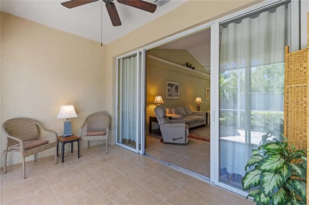 Welcome to this beautifully maintained villa in St. Andrews East at the Plantation Golf & Country Club—offered turnkey furnished and move-in ready. Thoughtfully designed with tasteful, neutral furnishings in fantastic condition, this home is both elegant and inviting. You’ll appreciate the open floor plan, enhanced by cathedral ceilings and crown molding. While the home features an airy layout, its rich finishes create a cozy, sophisticated ambiance. The spacious kitchen is a standout, featuring warm wood-toned cabinetry, gleaming granite countertops, stainless steel appliances, and a custom pantry expansion that offers more storage than the standard design. Tile flooring extends throughout the main living areas, with engineered wood in the bedrooms and den, adding a touch of warmth. The great room seamlessly flows into the lanai through a double set of sliders, creating an all-weather retreat. A roll-down sunshade adds versatility, and the private, landscaped view offers a peaceful setting with a preserve beyond. The screened lanai is the perfect place to unwind, enjoy Florida’s weather year-round, or entertain with a barbecue. The thoughtfully designed split-bedroom floor plan offers privacy and comfort. The generous primary suite features double walk-in closets—both equipped with additional shelving for optimized storage—dual vanities, and a spacious walk-in shower with refreshed grout (updated in 2022). Sliding doors provide direct access to the lanai, creating a seamless indoor-outdoor connection. The guest suite, made private with pocket doors, ensures visitors feel right at home. A versatile den with a sofa sleeper provides extra accommodations or a functional workspace. The laundry room includes ample cabinetry, a wash sink, and a newer washer that was replaced in 2019. Additional upgrades bring peace of mind, including IMPACT WINDOWS and clear Lexan storm shutters for the sliding glass doors, making storm preparation effortless. The HVAC system was replaced in June 2024, and the water heater was updated in 2017. With condominium ownership, exterior maintenance is fully taken care of, making it an excellent choice for frequent travelers or those seeking a truly carefree lifestyle. There is no CDD fee, and the neighborhood offers an active clubhouse along with two community pools. Optional membership to the Plantation Golf & Country Club provides access to two 18-hole championship golf courses, 13 Har-Tru tennis courts, six pickleball courts, Bocce Ball, a fitness center, a Jr. Olympic pool, and exceptional dining and social events. Perfectly located just minutes from beautiful beaches, shopping, dining, Wellen Park Downtown, the Atlanta Braves Spring Training Stadium, and convenient access to I-75, this villa offers the best of Florida living.