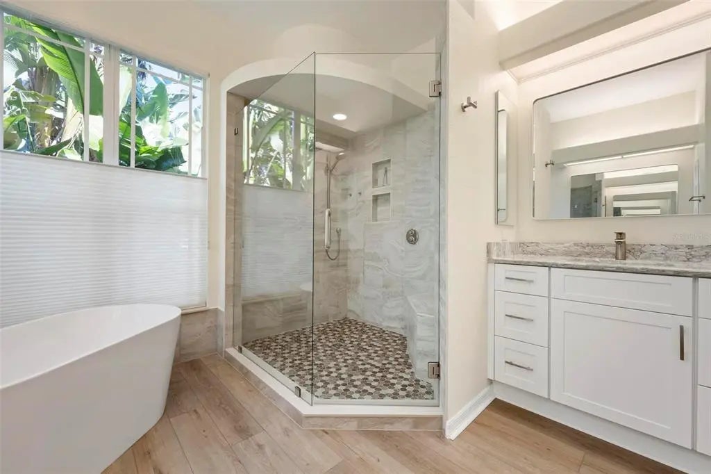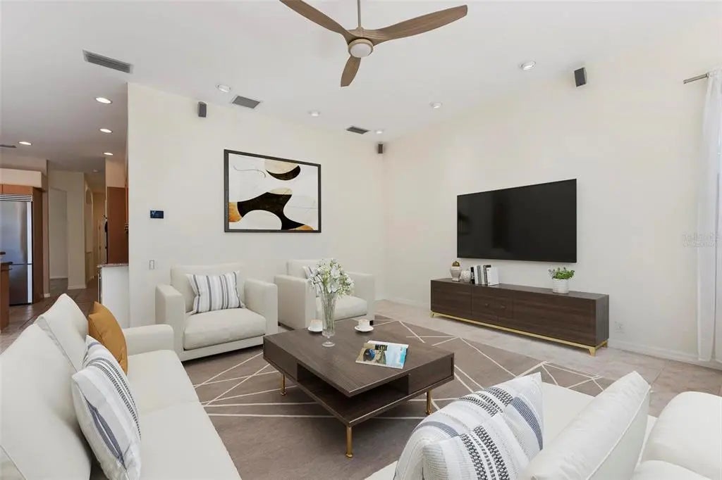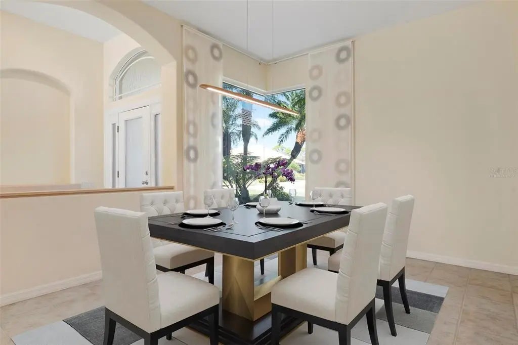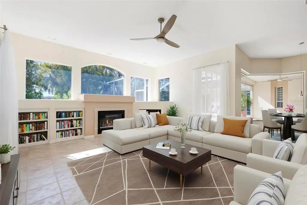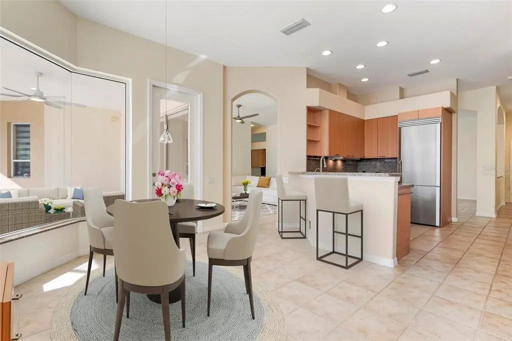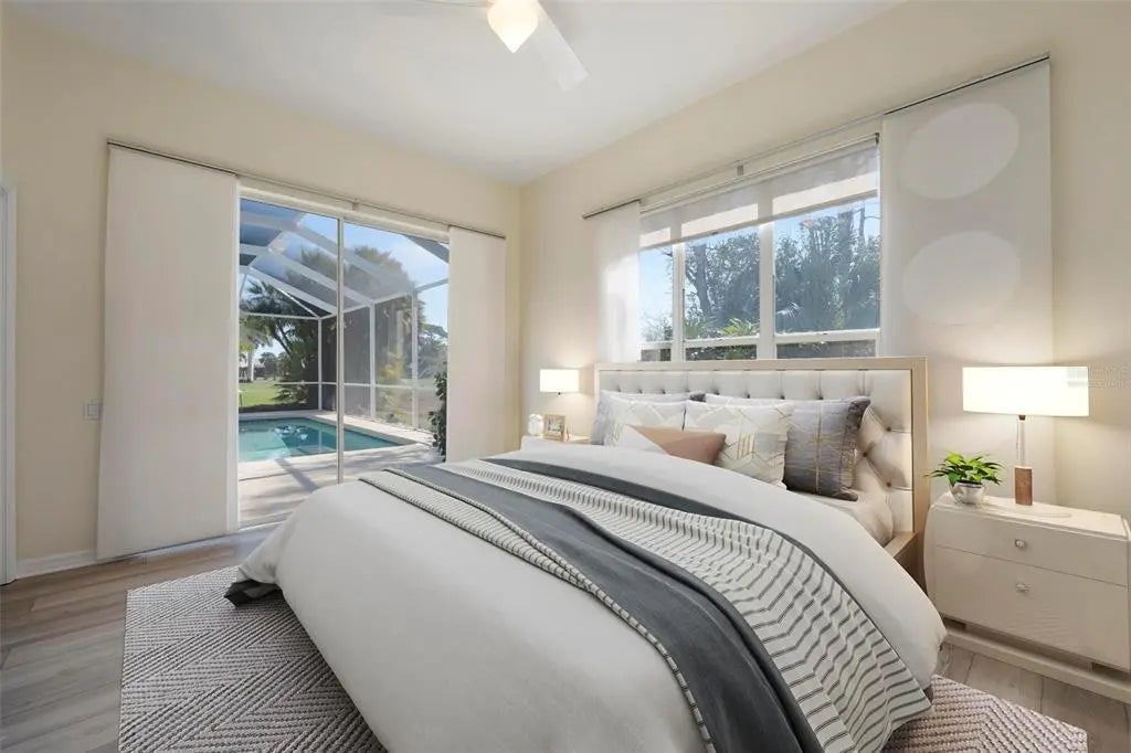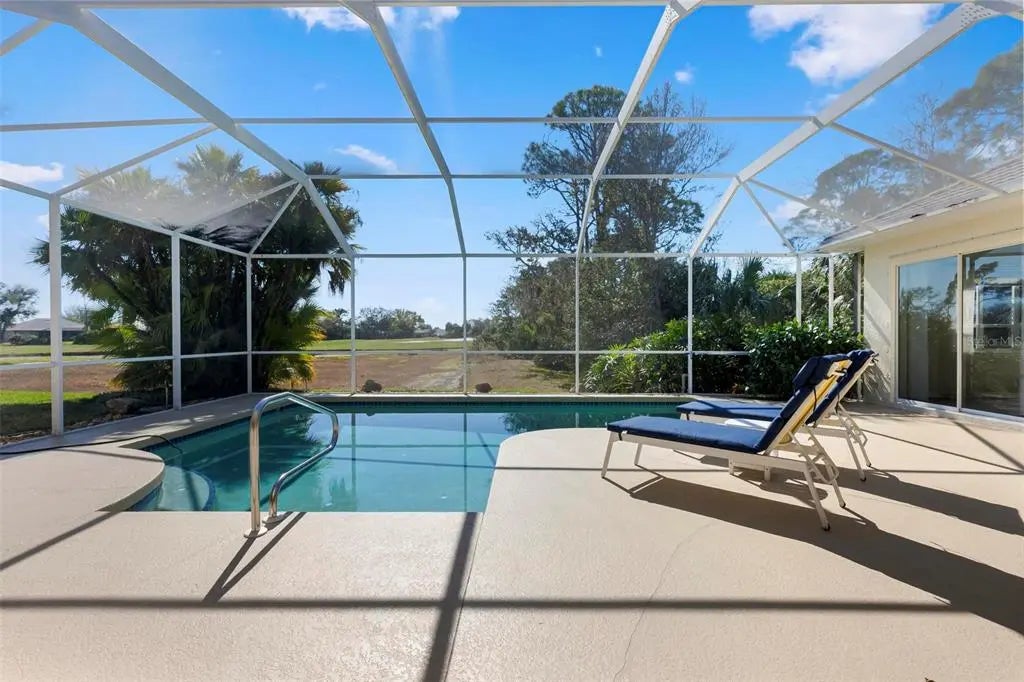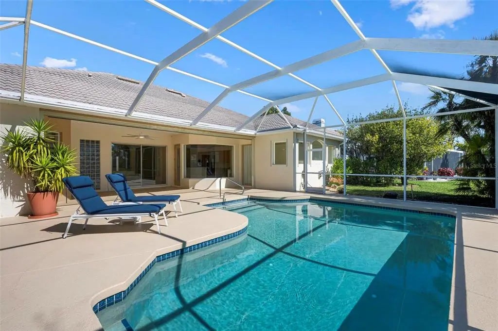 One or more photo(s) has been virtually staged. A serene, view-filled retreat where refined architecture meets effortless indoor outdoor living, framed by water, golf, and wooded views. Offering 2,900 sq. ft. with 3 bedrooms and 3½ baths, including a poolside en-suite casita ideal for guests or in-law use. Volume ceilings enhance both formal and casual living spaces, complemented by a built-in study and a contemporary European-style kitchen with premium appliances, granite counters, and a breakfast bar. An aquarium window frames tranquil pool and nature views. The spacious family room features a fireplace and natural media wall. The remodeled primary suite offers dual walk-in closets and a spa-style bath with soaking tub and frameless glass shower, while guest baths are similarly updated with quality finishes. Outdoor living is designed for privacy and entertaining, with expansive covered areas, a built-in grill, heated pool with new equipment, and a rescreened lanai for year-round enjoyment. In addition to interior renovations, recent mechanical and structural upgrades include two HVAC systems, all new pool equipment, pool enclosure screening, interior and exterior paint, Storm Smart Kevlar hurricane protection, hurricane-rated garage door, hot water tank, whole-house water filtration, and a kitchen water filter. Located in Pelican Pointe Golf & Country Club, residents enjoy clubhouse dining with no minimums, fitness center, heated community pool, tennis, new pickleball courts, 24/7 guard entry, and HOA fees that include lawn care, cable, and high-speed internet. Optional 27-hole golf membership or pay-as-you-play. Just minutes from Venice Island beaches, boating, dining, boutiques, and cultural venues.
