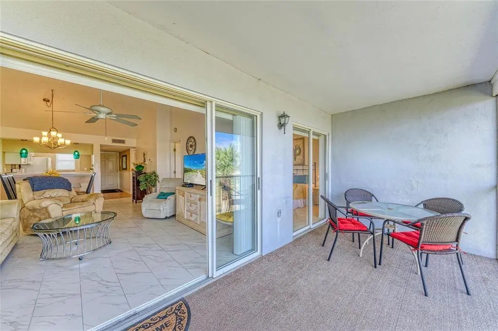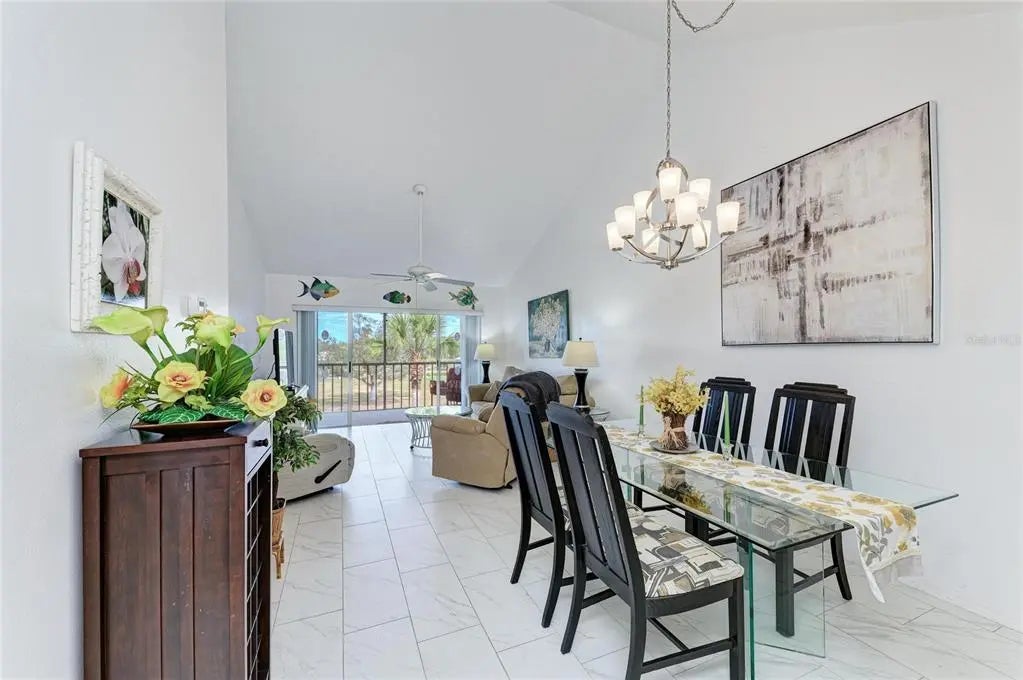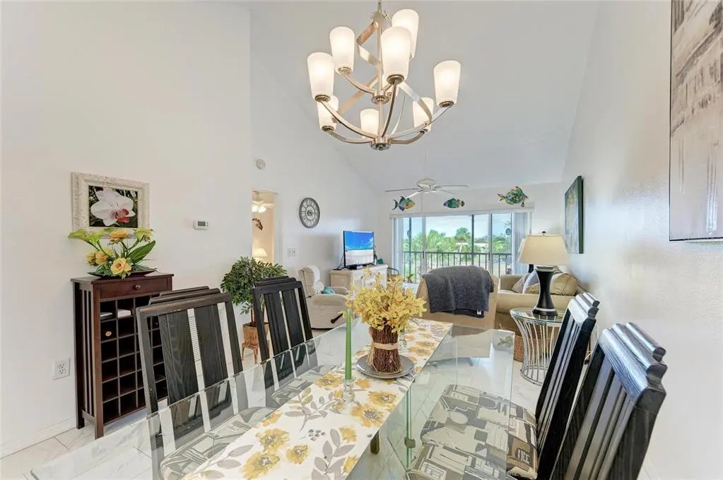 Penthouse unit featuring soaring ceilings and sweeping views of the golf course and lake. This charming 2-bedroom, 2-bathroom condo is offered fully turnkey and furnished, making it move-in ready. Recent updates include a new roof on the building, fresh exterior paint, and newer tile flooring throughout. Light and bright, the condo boasts large sliding glass doors that open to an oversized lanai—perfect for relaxing, entertaining, and taking in the beautiful surroundings that make The Plantation Golf & Country Club so special. Both bedrooms feature en-suite bathrooms and are spacious enough to comfortably accommodate king-size beds. The primary suite includes an updated shower, new flooring, and a very large walk-in closet ideal for storage. A secondary closet houses the washer and dryer for added convenience. Voluminous ceilings enhance the appeal of this top-floor unit, and the building is equipped with an elevator. Located directly across from the unit is a residents-only pool and clubhouse offering frequent social activities, including water aerobics and card games. Social or golf memberships are available separately. Storage closet inside assigned carport. Plenty of guest parking, as well. One covered carport for the unit.