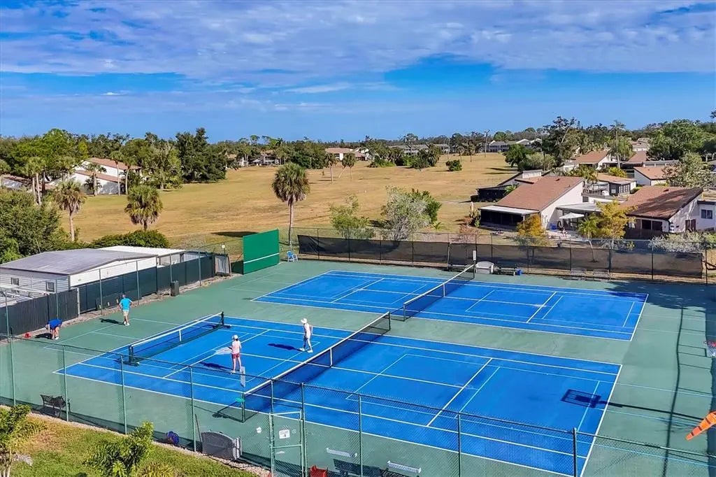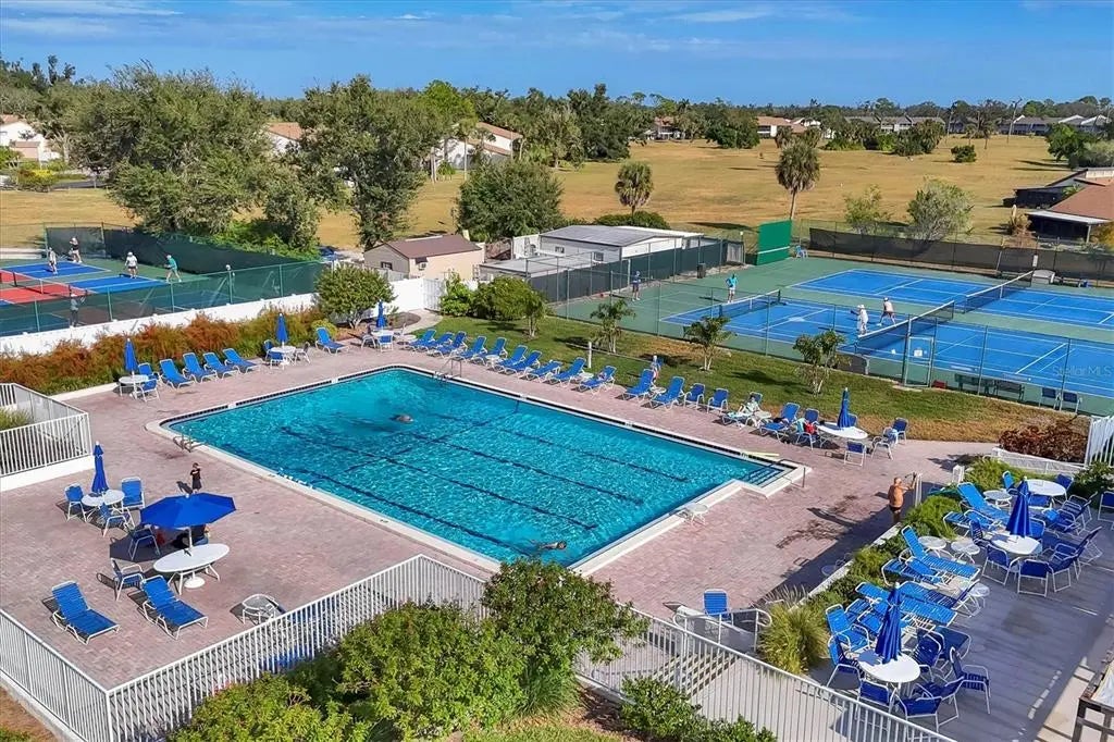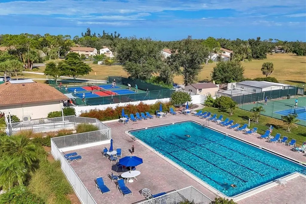 ***NEW: Seller is offering a $5,000 Closing Cost Credit***Live where every day feels like a vacation & with single floor living! Unique single-level Villa in Bird Bay Village’s Sea Grape community attached only by the carport for maximum privacy! This beautifully updated 2BR/2BA corner unit offers true one-floor living, soaring cathedral ceilings, and a thoughtful layout that blends comfort, function, and style. Step inside and feel instantly at home. The front screened lanai off the bedrooms offers a peaceful and private retreat—the perfect place to sip morning coffee, unwind with a book, or enjoy a gentle evening breeze. Out back, a private patio surrounded by lush green space invites you to create your own outdoor oasis for entertaining, small barbecues, or simply soaking in the Florida sunshine. Recent updates bring peace of mind with all-new piping, a 2023 roof, and luxury flooring throughout. The renovated bright kitchen features quartz countertops, tile backsplash, and GE Graphite appliances, while both bathrooms have been fully remodeled in contemporary style. The enclosed rear lanai adds valuable year-round living space with flexible use as a sunroom or reading nook. A standout feature, the tiled carport is enclosed with its own wall A/C unit—ideal for use as a workshop, studio, or craft area—and includes a Samsung front-load laundry pair plus additional storage. The private driveway provides easy parking for your vehicles. Bird Bay Village is known for its vibrant, resort-style lifestyle—heated Jr. Olympic-size pool, tennis, pickleball, bocce, shuffleboard, fitness center, library, meeting rooms, and a large clubhouse that hosts yoga, art, socials, and community events year-round. The community is set beside the Legacy Trail for walking, biking, or kayaking adventures, and centrally located just minutes from Venice and Nokomis beaches, boutique shopping, dining, golf, and the charming footbridge to Historic Downtown Venice Island. Located in Zone X (non-flood) and priced to sell, this unique villa offers a rare combination of privacy, convenience, and resort living—ideal for full-time residents or snowbird retreats. And yes, pickleball is huge here!