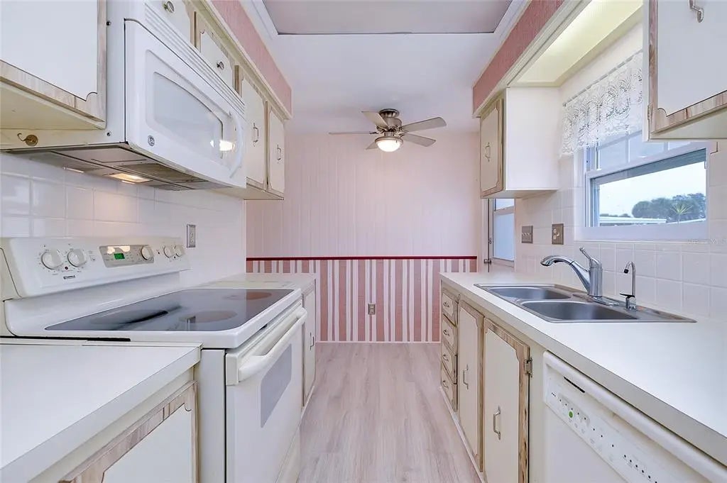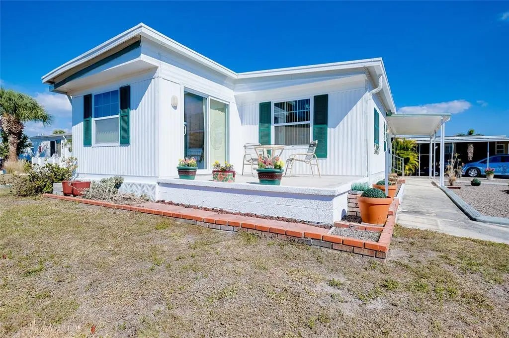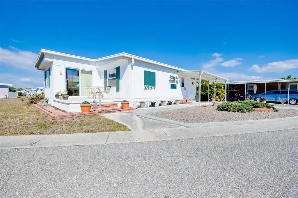 PLEASE ENJOY THE INTERACTIVE VIRTUAL TOUR OF THIS EXTREMELY RARE CORNER LAKE AND FOUNTAIN VIEW HOME. Ideally situated in the active 55+ community of Japanese Gardens, this resident owned, amenity rich neighborhood offers a vibrant coastal lifestyle. This move in ready residence is one of only a select few homes positioned with a direct lake and fountain view, creating a peaceful backdrop complemented by stunning western sunset exposure from your private patio. Inside, the well maintained two bedroom, two bathroom floor plan features a desirable split bedroom design with an expansive living room, formal dining area, galley kitchen, plus private en suite bathrooms in each bedroom. Interior highlights include luxury vinyl plank flooring throughout, built in dining cabinetry, a closet pantry, white kitchen appliances, and tiled backsplash. Major improvements consist of new vinyl windows and doors installed in 2015, whole home air conditioning replaced in 2020, and a new water heater in 2021, enhancing efficiency while providing long term peace of mind. The exterior offers a deep two car carport, oversized shed housing the washer and dryer hookups with generous storage space, concrete landscape curbing, and a welcoming front planter bed. Japanese Gardens features low HOA fees of $257 per month which include cable, water, sewer, plus exceptional amenities including pickleball, bocce, shuffleboard courts, a beautiful resort style pool and spa, large clubhouse, activity room with billiards tables, library, and a full calendar of social events, all within a golf cart friendly community. Perfectly positioned approximately two miles from Manasota Beach and just minutes to Venice Island shopping, dining, golf, fishing, boating waters, and additional Gulf beaches, this home presents an outstanding opportunity to embrace coastal living, an active social environment, and everyday convenience in one of Venice’s most desirable 55+ communities.