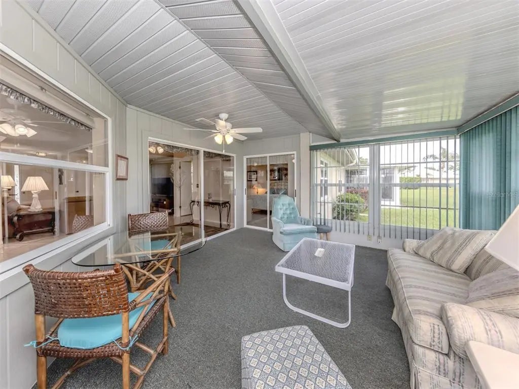 Meticulously maintained and move-in ready, this charming furnished villa is in Heron Shores which offers a blend of comfort, style and Florida lifestyle living. Go through the foyer into an inviting living room that flows into a spacious dining area, positioned just off the bright kitchen. The kitchen features a breakfast bar and a beautiful new backsplash, adding a stylish accent to the functional layout. This desirable split floor plan includes two bedrooms, offering privacy and space. The primary suite features a walk-in closet, en-suite bath with double vanities and a walk-in shower. The guest bedroom includes a cozy nook, ideal for a desk or reading space, and the guest bath has been updated with a new vanity. Easy-care tile flooring runs throughout the home, while the enclosed Florida room with indoor-outdoor carpet offers additional living space to relax or entertain. Recent upgrades include two hurricane-impact windows in the primary bedroom for peace of mind. Heron Shores is a vibrant, centrally located community with a beautifully updated clubhouse, fitness room, library, community pool and hot tub, tennis and pickleball courts, basketball and scenic recreational trails. Whether you're looking for a full-time residence or a winter retreat, this villa offers the Florida lifestyle you've been dreaming of!