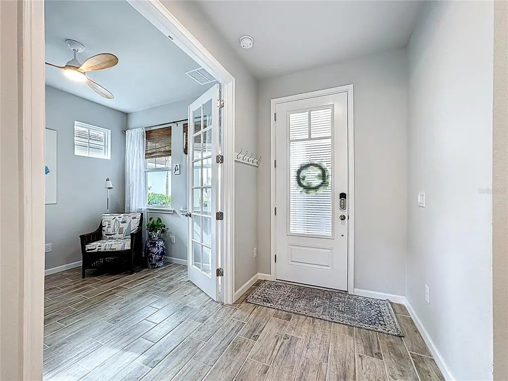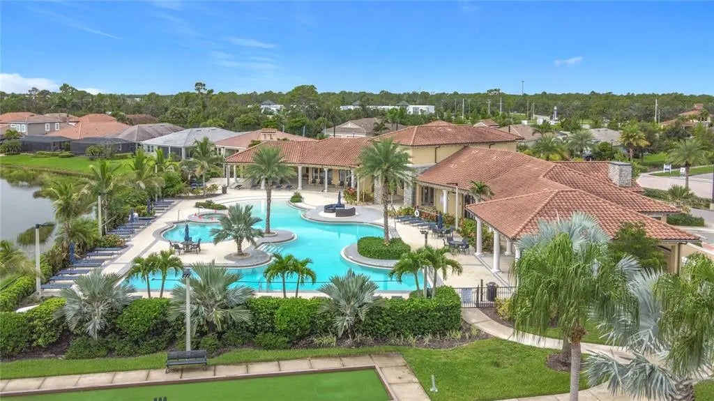 Welcome to refined, low-maintenance Florida living in this impeccably maintained Largo model villa, ideally situated within the sought-after, gated community of Renaissance at Wellen Park. Built in 2022 and gently enjoyed, this move-in-ready residence showcases contemporary design, elevated finishes, and thoughtful custom enhancements—all set against the serene backdrop of a screened lanai and private backyard retreat. A decorative paver driveway and walkway lead to a charming covered front porch and striking glass entry door. Inside, a light-filled foyer reveals a spacious open-concept floor plan designed for both comfort and entertaining. Wood-look plank tile flooring, 8-foot interior doors, upgraded lighting and ceiling fans, and a statement shiplap accent wall create a refined yet inviting ambiance. Just off the foyer, a versatile den with French doors offers flexibility - ideal as a home office, third bedroom, media lounge, or hobby space. The split floorplan ensures privacy for guests, who will appreciate the generously sized secondary bedroom and full bath with a quartz vanity and tub/shower combination. At the heart of the home, the gourmet kitchen flows seamlessly into the dining and living areas. The main living space is enhanced by plantation shutters and abundant recessed lighting. The kitchen features 42-inch cabinetry, quartz countertops, stainless steel appliances, under-cabinet lighting, and upgraded pendant fixtures—balancing style and function with ease. Sliding glass doors extend the living space outdoors to a screened lanai and expanded paver patio, offering a lovely setting for morning coffee, evening cocktails, grilling, or relaxing year-round. The primary suite is a private retreat with a spa-inspired bath featuring dual vanities, a tiled walk-in shower, private water closet, and a customized walk-in closet with added shelving and double hanging rods for optimum storage. Additional highlights include full hurricane shutters, a tile roof, and the added peace of mind of being located in Flood Zone “X.” Residents enjoy resort-style amenities including a zero-entry swimming pool with lap lanes and spa, fully equipped fitness center, clubhouse with catering kitchen, outdoor fireplace patio, tennis and pickleball courts, playground, and dog park. Lawn care is included in the HOA fee, allowing for truly carefree living. Ideally located just minutes from Downtown Wellen Park, CoolToday Park (Spring training home of the Atlanta Braves) area dining, shopping, farmers markets, I-75, Tamiami Trail, Venice beaches, historic downtown Venice, and Costco, this home offers exceptional convenience within one of the region’s most vibrant master-planned communities. The impeccable furnishings are also available for sale under separate purchase...allowing you to move right in and start enjoying your slice of paradise! Why wait to build when this gently loved home is available now in an established neighborhood with no construction delays or unexpected costs? Experience the perfect balance of modern elegance, effortless maintenance, and dynamic community living in one of Wellen Park’s most desirable enclaves.