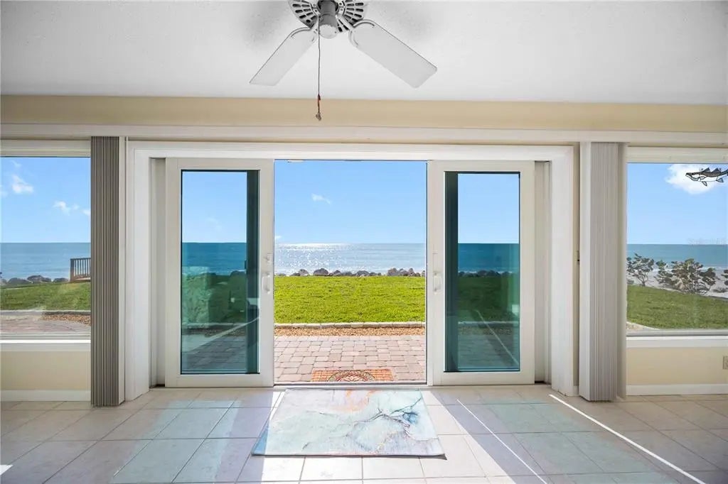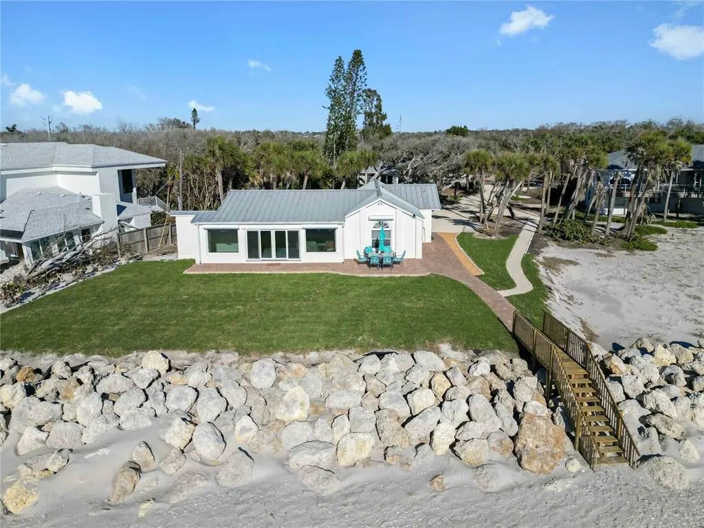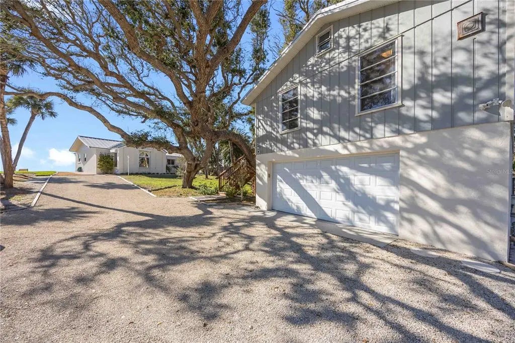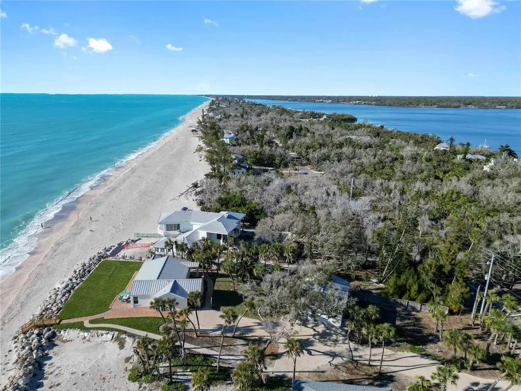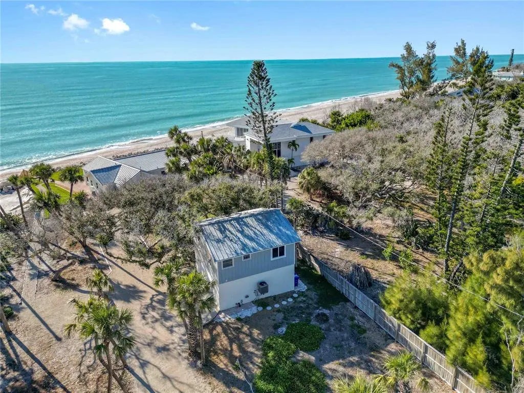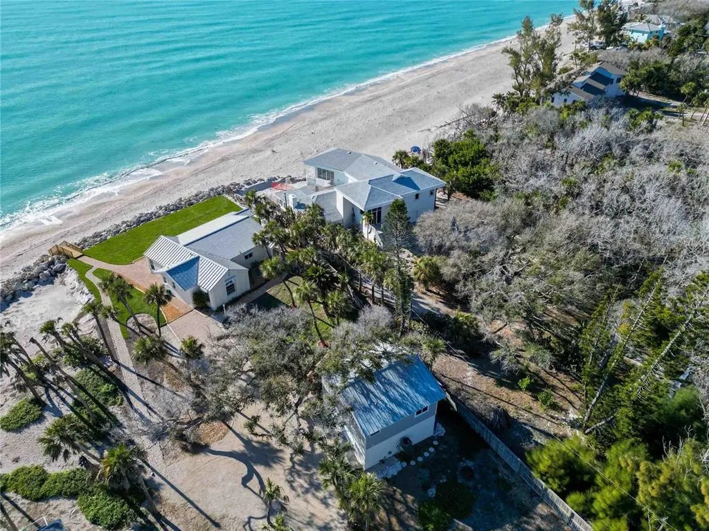 Premier Gulf-front gem on secluded Manasota Key, Englewood — where true privacy meets unbeatable coastal living. This rare 3-bedroom, 3.5-bath compound spans over 2,200 square feet on more than half an acre, with 100 feet of private beachfront directly on the Gulf of Mexico. The main residence offers two bedrooms and two-and-a-half baths, while a detached 576-square-foot guest suite above a two-car garage — complete with bedroom, full bath, kitchen, dining, and living areas — delivers total flexibility for guests, family, or rental income. Step outside to your own front-row seat to sea turtles laying eggs and hatching during season — one of the rarest wildlife experiences anywhere. This stretch of beach is famous for shark teeth finds, including big Megalodon fossils. No crowds, no noise — just you and the water. The elevated yard sits behind a large rock retention wall, providing serious storm protection and a commanding view of the Gulf. Brand-new sod, freshly built stairs, and new pavers throughout give the entire property a finished, move-in-ready feel. Inside, new impact windows, sliders, and a full irrigation system round out the upgrades — this home has been thoughtfully improved top to bottom. A deeded dock slip across the street on Lemon Bay is perfect for calm launches, kayaking, or quick Gulf access. Seclusion, views, and waterfront ease — direct Gulf of Mexico frontage ideal for sunrises, barefoot walks, effortless boat rides, and legendary shelling on your own sand.