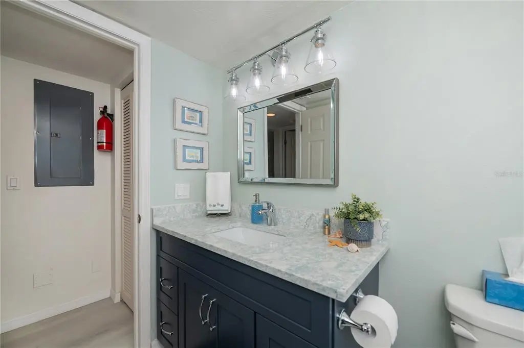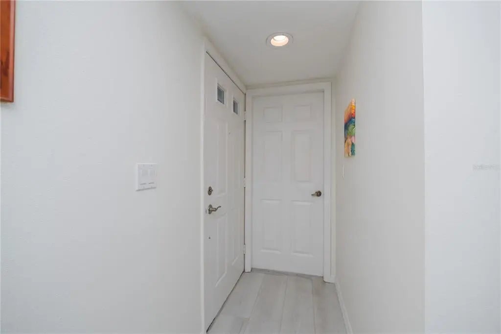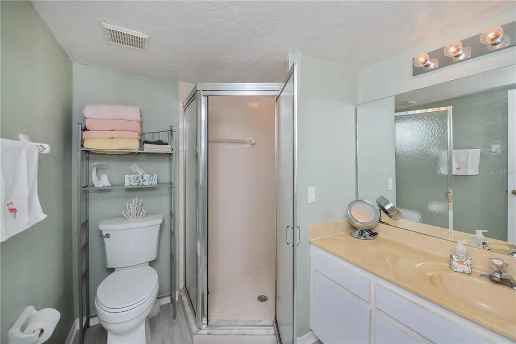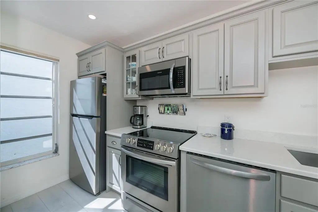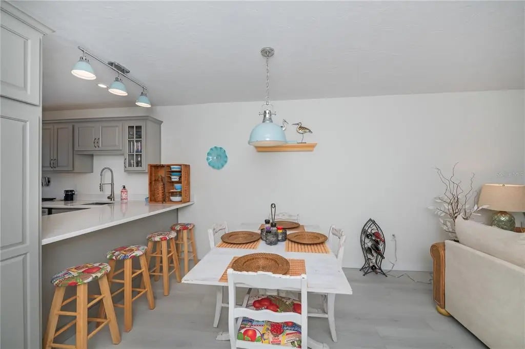 Welcome to this beautifully updated FIRST FLOOR, 2-bedroom, 2-bath condo just minutes from the Gulf Coast's most desirable destinations. Enjoy the convenience of a PRIVATE GARAGE w/DIRECT ENTRY INTO THE CONDO, a highly desirable feature to avoid any inclement weather and no stairs to navigate. This move-in ready home features a spectacular designer kitchen with gorgeous quartz countertops, wood cabinetry with soft-close drawers and doors along with stainless steel appliances, perfectly blending style and functionality for everyday living and entertaining. The washer and dryer are in a closet in the kitchen next to the pantry closet for your convenience. Stylish Luxury Vinyl Plank flooring flows seamlessly throughout most of the home. High impact windows and door across the back end of the extended living room create a beautiful garden view along with safety. The guest bathroom has been totally remodeled showcasing stunning quartz countertops, higher vanity & WALK IN SHOWER creating an upscale feel throughout. NEW ROOF 2024, New UPGRADED CAPACITY A/C. Hunter Douglas shades & Verti glides provide privacy & light control. Residents enjoy the resort amenities such as the heated pool, pickleball, tennis & shuffleboard making it easy to have an active & social lifestyle. Located just 4 miles from Venice Beach and historic downtown Venice with its unique shops and popular local restaurants makes this the perfect location whether this will be your vacation spot or full-time residence. Call for your private showing today!
