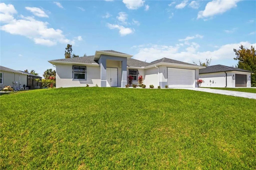 Brand-new custom home in the highly sought-after waterfront community of South Gulf Cove, offering modern design, quality construction, and a bright open layout that today’s buyers are searching for. This beautiful 3-bedroom, 2-bath home features high ceilings and 8-foot doors throughout, creating an airy, light-filled interior that immediately feels spacious and welcoming. The centerpiece of the home is the impressive chef’s kitchen, designed for both everyday living and entertaining, featuring granite countertops, soft-close cabinetry, GE stainless steel appliances, a Broan range hood, farmhouse sink, oversized center island, and a large walk-in pantry with exceptional storage. The open living and dining areas flow seamlessly to the covered paver lanai, providing the ideal indoor-outdoor living space Florida buyers love. The private primary suite offers a relaxing retreat with sliding glass doors leading to the lanai, double-door entry into the en-suite bathroom, and a unique layout that connects the spacious walk-in closet directly to the laundry room for added convenience. The primary bathroom features quartz countertops, dual vanities, modern finishes, and a large walk-in shower. Two additional bedrooms are located on the opposite side of the home and share a stylish guest bathroom with quartz countertops and contemporary design. Exterior highlights include impact-rated windows and doors, Bahama shutters, paver driveway, epoxy-coated garage floor, irrigation system, and a large covered paver lanai perfect for relaxing outdoors year-round. Located in the popular South Gulf Cove boating community, residents enjoy access to community boat ramps, parks, dog parks, pickleball courts, and a clubhouse. The home is ideally positioned just a short drive or boat ride from Boca Grande and its world-famous beaches, while also being close to the shopping, dining, and entertainment of Englewood and Port Charlotte. New construction homes with these upgrades in South Gulf Cove are in high demand. Schedule your showing today before this one is gone.