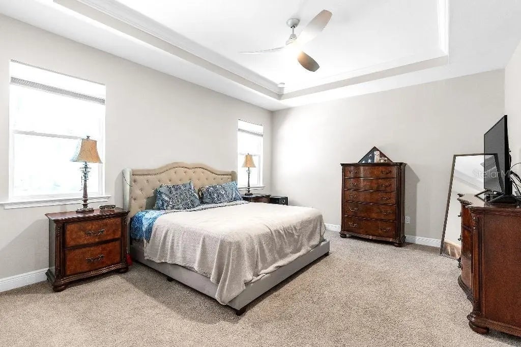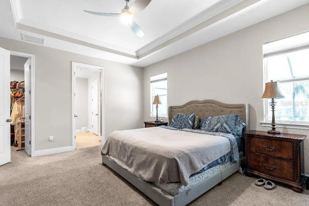 - Interior FeaturesCeiling Fan(s), Crown Molding, Eating Space In Kitchen, High Ceilings, In Wall Pest System, Kitchen/Family Room Combo, Living Room/Dining Room Combo, Open Floorplan, Solid Surface Counters, Solid Wood Cabinets, Split Bedroom, Stone Counters, Thermostat, Tray Ceiling(s), Walk-In Closet(s), Window Treatments