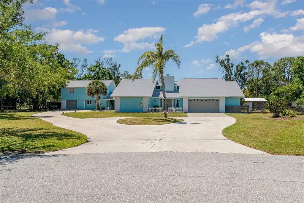 One or more photo(s) has been virtually staged. Venice acres family compound on over an acre of land on quiet cul de sac, Main Home features 3 bedrooms, 3 baths, enter to large family room with vaulted ceilings and wood burning fireplace, sliders to the back porch and screened private pool area with large newer hot tub, large eat in kitchen with Island, New Stone counters and lots of cabinets, living room leads to inside laundry and the 3rd bath with outside entrance, on the far side of home is large Primary bedroom with walk in closet and second closet, primary bath is recently redone and has access to the pool area, 2nd and 3rd good sized bedrooms with large bath between, oversized 2 car garage has an additional bonus room or extra storage or a hobby room, from the pool area is a large porch that separates the main home from the guest house with a studio apartment downstairs, upstairs is a fantastic 2 bedroom 1 bath vaulted ceiling apartment ( Guests, In laws) , underneath is an additional garage and a carport that could be a stable for your horse, large circular driving and tons of potential to house not only an extended family but all your toys, boats, RV , etc. The main home and the guest house each have a recent new roof, Reverse Osmosis for all properties , backyard is fully fenced, Many new items since 2021 including the Air conditioner, Kitchen flooring and stone counters, New Electric panels in both houses, New well, new RO system in both houses, New Paint inside and out, new fence, New refrigerators, Carport/Horse stable was redone, New House panel hook up for a generator, there is so much home for the money here and endless possibilities to make this your dream paradise !!!
