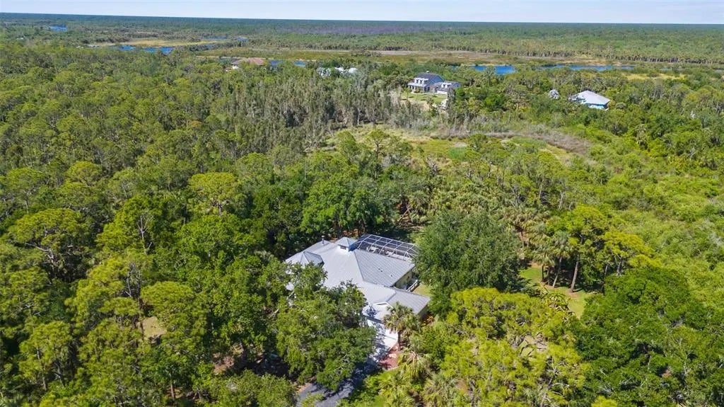 Welcome home to 710 N River Rd.... a three bedroom, 2 bath, custom built Key West Style home nestled on 5 acres within Myakka River Trails. Your breath will be taken away as you enter this unique community reminiscent of Old Florida... The developer’s vision was to establish a community that would complement the existing flora which is evidenced by it’s low density of properties accessible by a private road graced with majestic pines, tall palms and a canopy of spreading oaks. This beautiful home greets with an expansive wrap around porch. Inside find open layout with high ceilings, a functional cupola, large windows, solid interior doors and spacious rooms throughout. A floor to ceiling limestone fireplace (locally mined) warms the great room. Pocketing 12’ glass doors open to the lanai/pool area with private nature views beyond. The kitchen was just updated with beautiful quartz countertops, marble backsplashes, stainless steel sink and faucet. Other recent updates include new light fixtures and ceiling fans throughout, out-building HVAC and new pool heater. The charming 525 sq.ft. out-building (previously used as a woodworking shop) awaits your customized use- art studio, guest and/or in-law suite, home gym, man cave, she shed, home office, additional two car garage... your vision, your special space! Large private property is a rare find and sure to provide you with a daily refresh/reset... enjoy homegrown guava, star fruit and bananas by day and be lulled asleep at night by your resident barred owl. Community amenities include a private boat dock, clubhouse with community pool, pavilion, lighted tennis courts and playground. Nearby Wellen Park offers many points of interest- sports, shopping, entertainment, a weekly farmer’s market... Minutes away is charming downtown Venice with it’s great restaurants and beaches. And with I75 just down the street all that SW Florida has to offer conveniently awaits you. This truly special property is the one you’ve been waiting for!