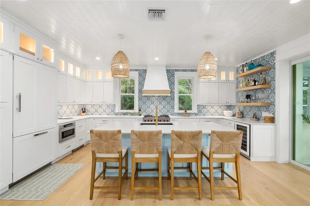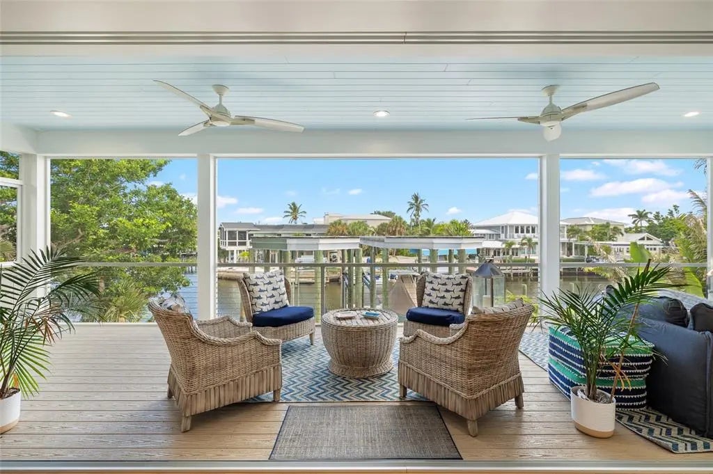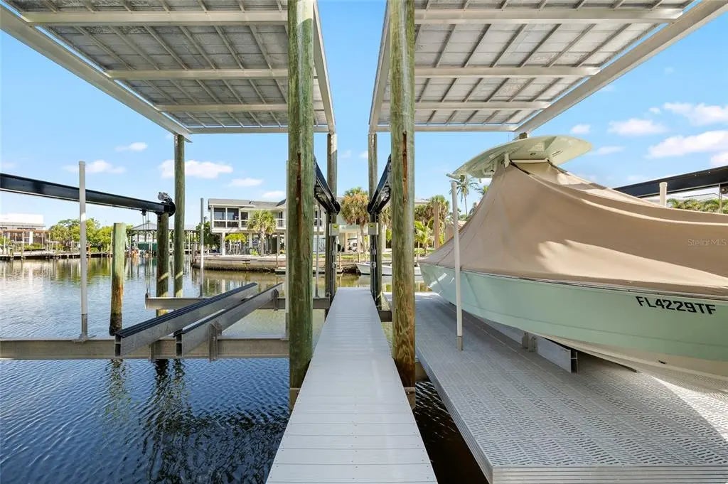 Coastal Luxury Meets Thoughtful Design – Completed in October 2024, this beautifully crafted 4-bedroom, 3.5-bath residence offers a perfect blend of coastal charm and modern luxury. Inside; engineered white oak hardwood & custom tile work throughout, accented with Serena & Lily wall coverings and Pottery Barn window treatments elevating the interiors. An elevator all three levels and two sets of washer/dryers on the two elevated living levels add comfort and convenience. The main living level features two en-suite bedrooms & bathrooms, tasteful dining area including bar cabinets for ease of service off the kitchen & bar dining features off the living room, also overlooking the waterfront! The Master level offers a spectacular en-suite with two large banks of built-in cabinetry with a spacious walk-in closet. Top level back bedroom/den/office/library smartly enhances the Master experience. Ground level 2 car plus golf cart+ garage offers lots of storage, even more air-conditioned storage & excellent bonus space. The bunk room showcases custom-built beds, creating a perfect retreat for the youngsters. The exterior is built to the highest standards with Hardie board siding, spray foam insulation, hurricane-rated windows and doors, and rebar-reinforced walls—ensuring peace of mind with zero structural impact from recent Storms. Features include tile flooring and Azek batten board detailing, providing both durability and style. The roof system is engineered with high-quality trusses and finished with premium roofing materials for long-lasting protection. Stucco and siding are complemented by custom exterior accessories such as corbels, shutters, and awnings for a refined coastal look. Outdoor living is enhanced with expansive decking, handrails, aluminum screen systems. Additional highlights include a pool and spa with paver surrounds, professional landscaping, and a paved driveway and walkways that complete the enchanting curb appeal. Outdoor living shines with four covered porches, a main level also screened porch features a full summer kitchen and grill overlooking the pool out to the dock! Master level French doors lead out to another spacious covered deck overlooking the also covered boathouse—with some Harbor view! A large outdoor shower off the sparkling pool by Tropical Pools, out to the private covered dock with two custom 20,000 lb lifts and room for an additional skiff. Multiple storage closets and lockouts provide excellent space for gear and organization. This home is designed for effortless coastal living with every detail thoughtfully considered. A must-see for a New Construction aficionado!