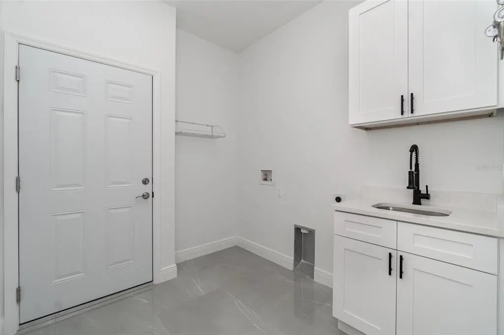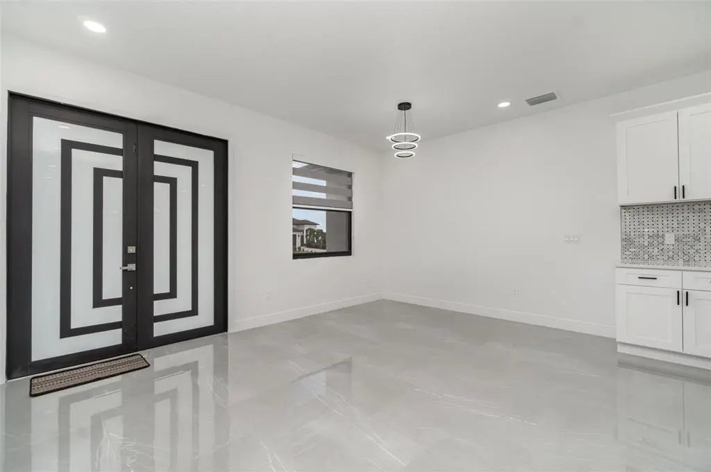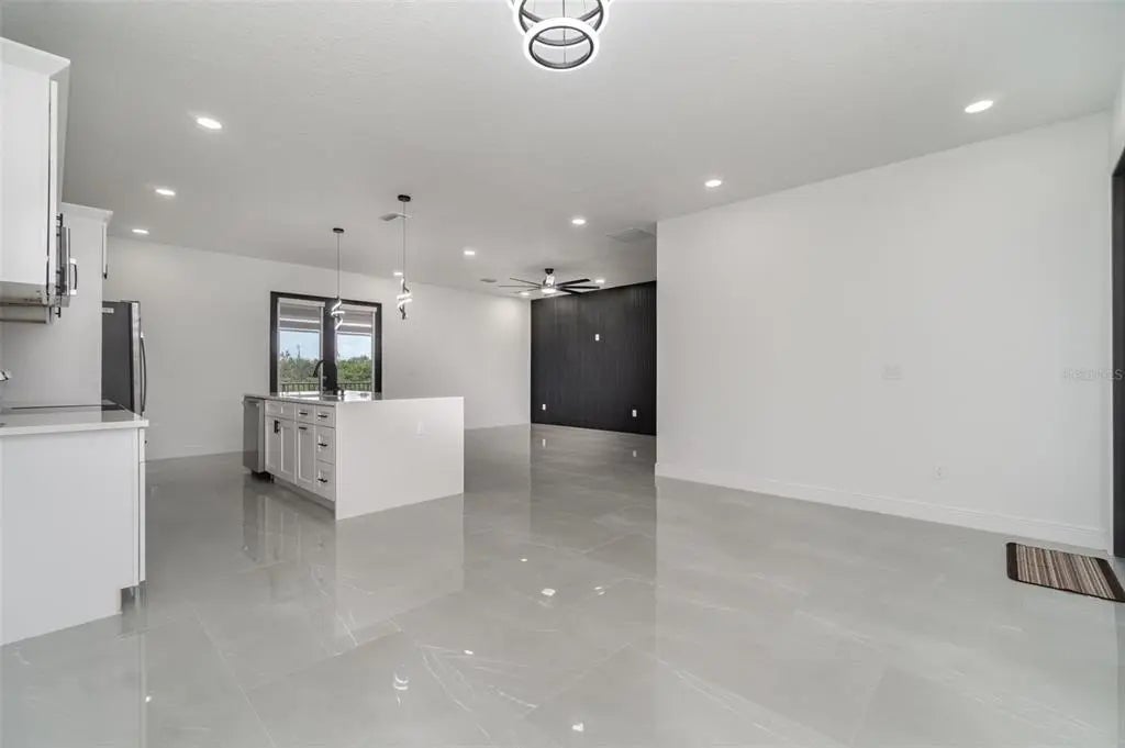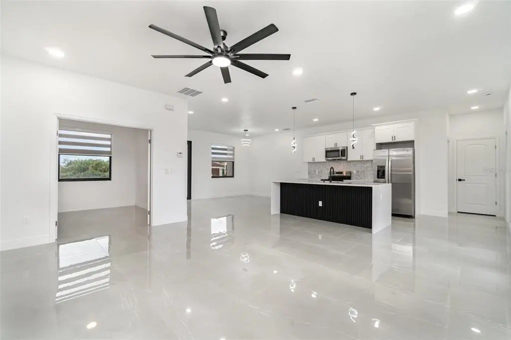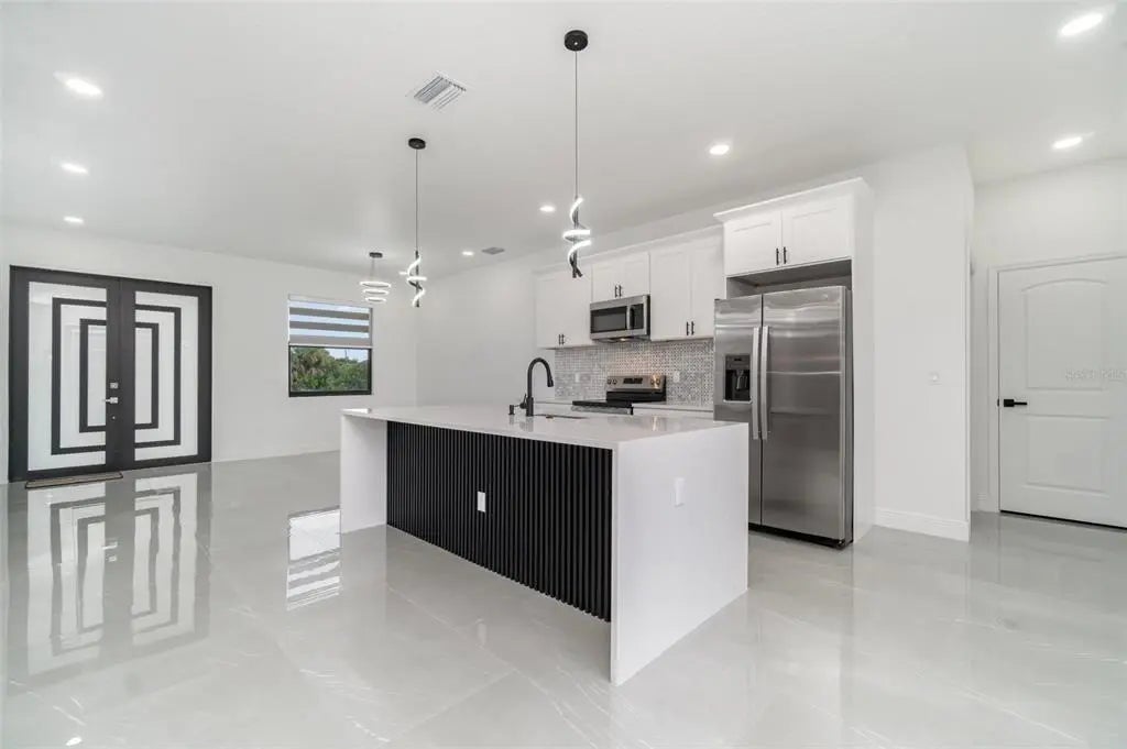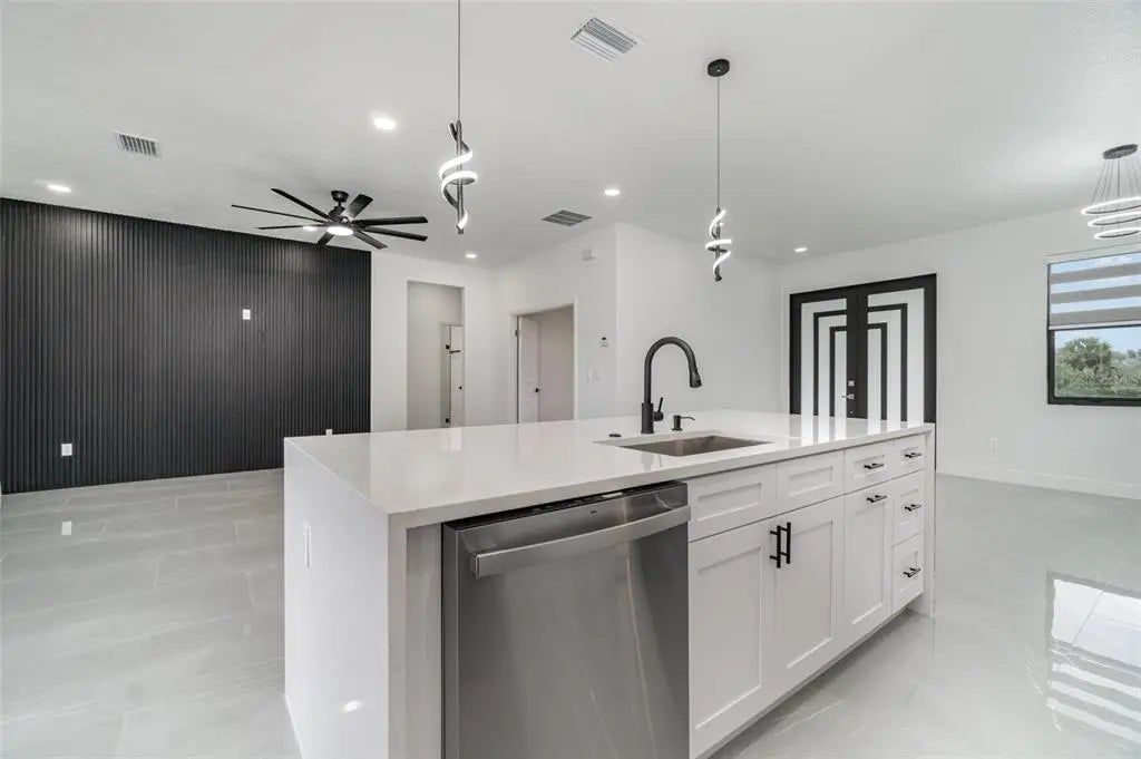 Owner Will Assist with Buyer's Closing Costs. New construction in South Gulf Cove with clean, modern lines and seamless indoor-outdoor living. Single-story 3BR + office / 2BA / 2-car garage. Open concept with large-format porcelain tile throughout, striking frosted-glass double entry, slat accent wall and designer lighting. Show-stopping kitchen features an XL waterfall quartz island, shaker cabinetry, mosaic backsplash, stainless appliances and fixtures. Owner’s suite has dual vanities, frameless glass shower and a freestanding soaking tub. Bright secondary bedrooms with modern fans and zebra shades. Generous laundry room with sink and cabinets. Relax on the covered lanai with wet bar overlooking the backyard—perfect for grilling and entertaining. Minutes to Gasparilla Rd/FL-776, marinas, beaches and golf. Move-in ready and easy to show.