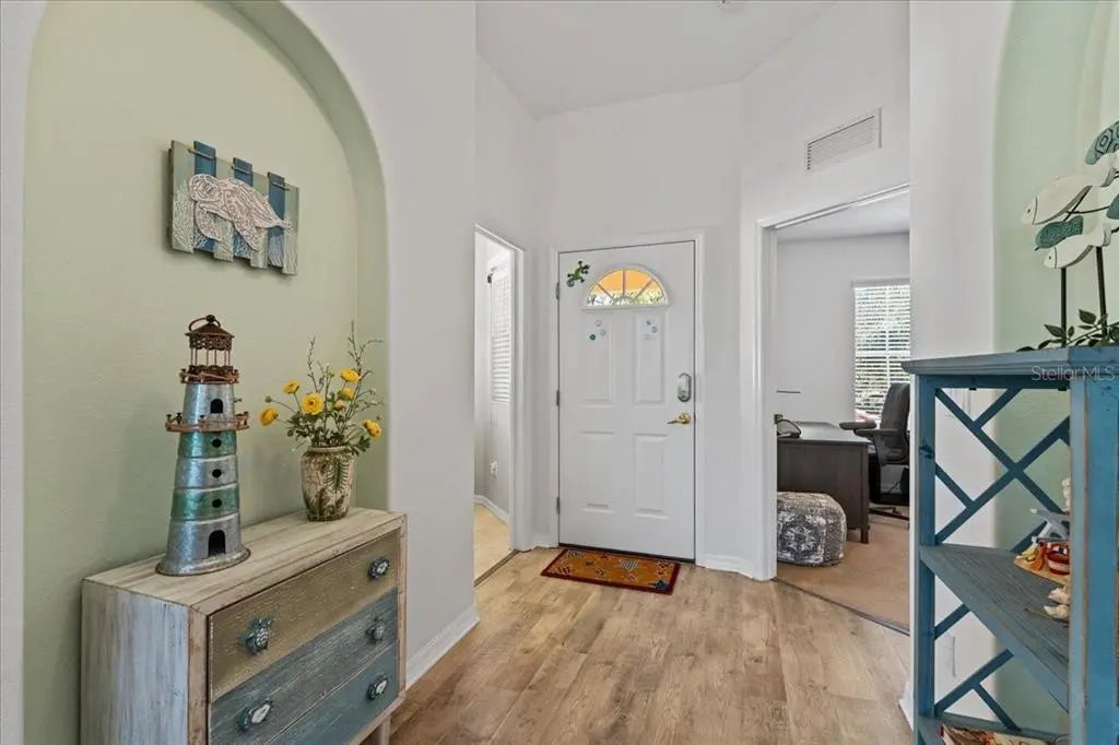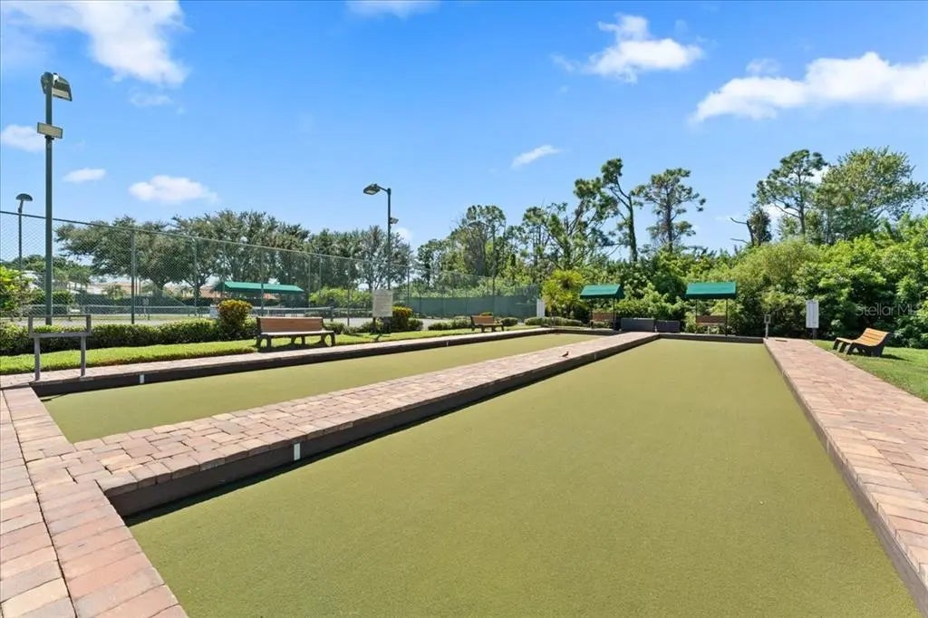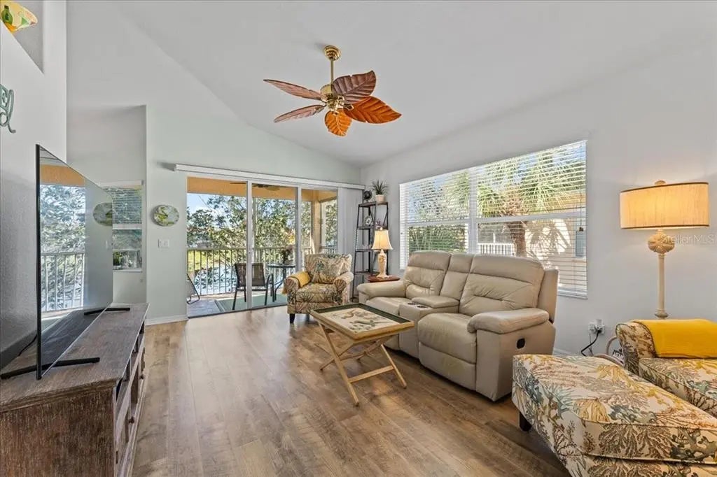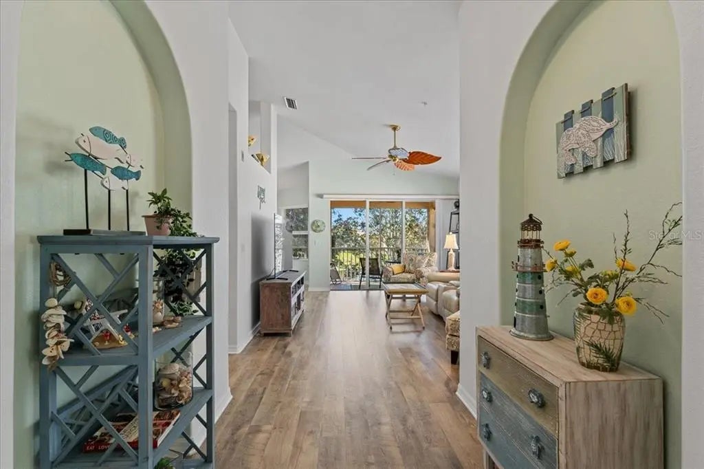 Welcome to the premier resort style gated community of Casa di Amici in Venetia! This lovely well designed 1383 sq. foot residence offers a private one car garage plus convenient parking at your doorstep. An inviting entrance with seating leads you into the 3 bed 2 bath home with high cathedral ceilings, providing height and light to this seamless open space with a thoughtful split bedroom floorplan. Check out the beautiful flooring and comfortable living room with ceiling fan. The gorgeous kitchen offers quality cabinets, gleaming quartz tops, under counter lighting and upgraded appliances, including a new Bosch dishwasher and a fridge with ice and water dispenser. You will love this kitchen! From the dining room you can look out over the tropical pond and there's plenty space to entertain friends and family. Nice primary suite with 2 separate closets, one of which is a large walk in closet. The master bath provides dual sinks and a private spot for the commode. Two more nice size bedrooms can serve as guest rooms or home office. The "wow" spot is the screened back lanai, which is where you can spend your time watching the sparking pond, fountain and Florida wildlife, while mature landscaping lends total seclusion and serenity. It's a perfect place to enjoy the sunset. Convenient laundry room with room for cleaning essentials and additional storage. This home is in superb move in condition and the foreign sellers are including all the furniture and equipment with the sale. If you prefer bringing your own, we can get the content removed. Brand-new ac system 2024, new hot water heater 2020. Get fit at the gym or enjoy a swim in the sparkling pool. Furthermore, you can play tennis, shuffleboard, pickleball, basketball, bocce or join at the activities in the fabulous clubhouse. Pets are welcome.
