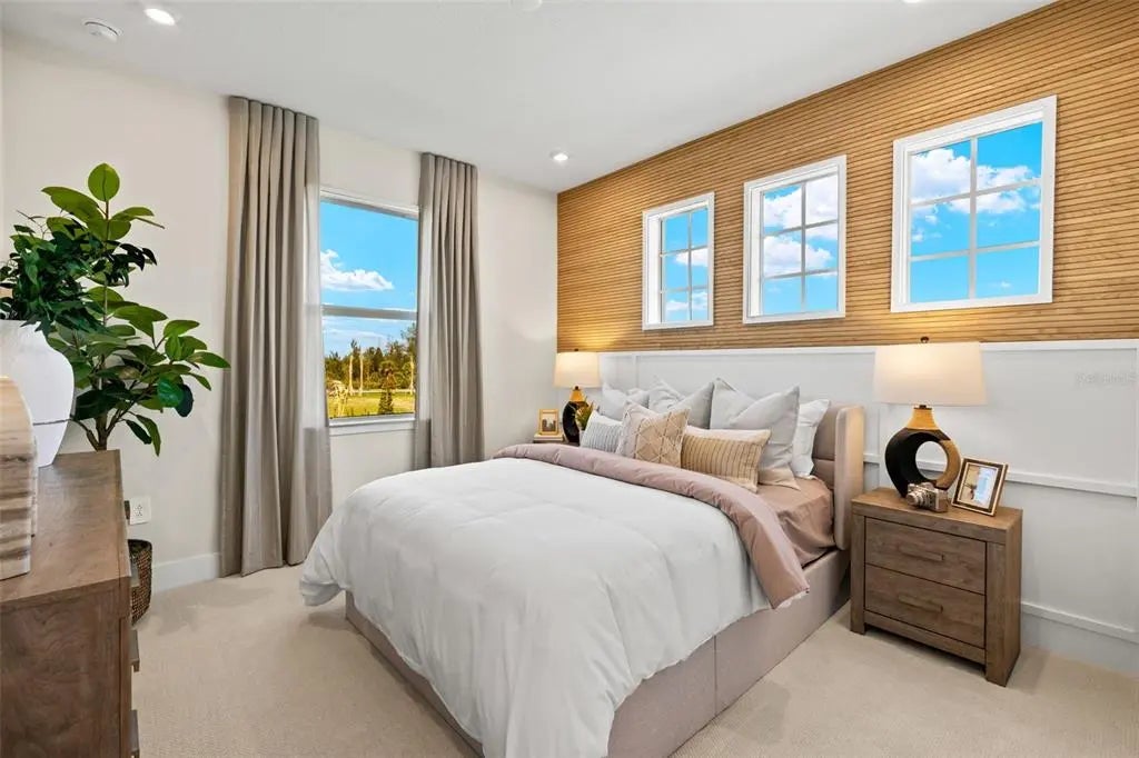 Discover elevated living in the Evergreen, a spacious two-story coach home offering 2,316 sq. ft. of thoughtfully designed space in the resort-style community of Palmera at Wellen Park. This upper-level residence combines coastal architecture with modern convenience, featuring impact-resistant windows, a private two-car garage, and a screened lanai perfect for enjoying Florida’s year-round sunshine. Inside, the open-concept layout is filled with natural light and enhanced by 9'4" ceilings and luxury vinyl plank flooring in a warm, driftwood-inspired tone. The executive kitchen is a showstopper, with crisp white shaker-style cabinetry, soft-close drawers and doors, and quartz countertops in a soft stone-gray finish with subtle veining that evokes the look of natural soapstone. A wall oven, cooktop, and ENERGY STAR® certified refrigerator complete the stainless steel appliance suite, while a stacked glass backsplash in a brickset pattern adds a designer touch. The great room and dining area flow seamlessly to the lanai through triple-slider glass doors, creating a perfect setting for entertaining or relaxing. The owner’s suite is a private retreat with a spa-inspired bath featuring a dual-sink raised vanity, glass-enclosed shower with bench seat, comfort-height toilet, and a walk-in closet large enough for a full bedroom suite. Bedrooms two and three are located on the opposite side of the home and share a full bath with a walk-in shower. A powder room and a versatile loft space provide flexibility for guests, hobbies, or a home office. The laundry room includes an ENERGY STAR® washer and dryer and is pre-plumbed for a utility tub. Smart home features include an Alexa-enabled thermostat, ClareOne touchpad, smart lock, and video doorbell for added convenience and security. Residents of Palmera will enjoy access to a full suite of resort-style amenities opening in spring 2026, including a clubhouse with a fitness center, resort-style pool with lap lanes, fireside lounge, pickleball courts, golf simulator, grill pub, and on-site dining. Outdoor spaces are thoughtfully designed with a splash pad, playground, paw park, community garden, and expansive event lawns for year-round activities. Located just minutes from Downtown Wellen Park, CoolToday Park, top-rated beaches, golf courses, and Sarasota’s cultural attractions, Palmera offers the perfect blend of luxury, convenience, and vibrant community living.