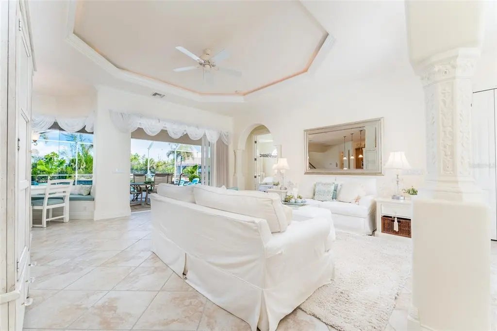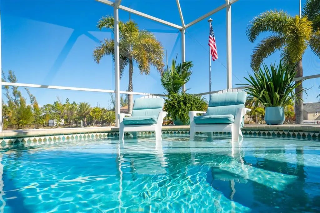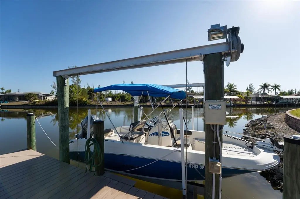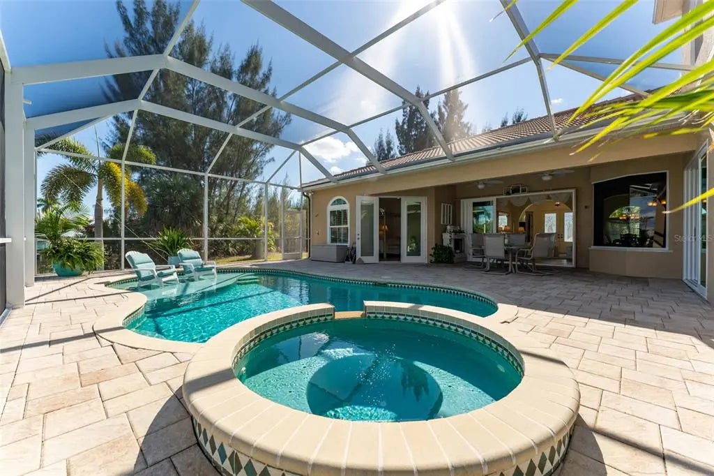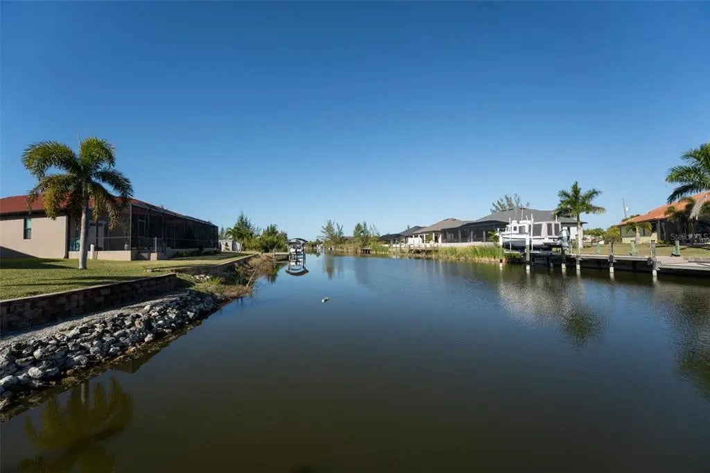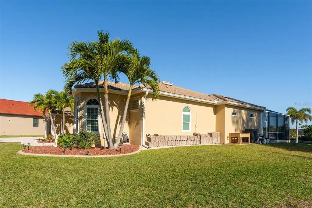 Where your backyard is the water and your garage can hold your vacation home on wheels! This isn’t your typical waterfront home—this one is made for boaters, RV owners, and toy collectors.The property offers deep water access (no bridges) to Port Charlotte’s boating destinations and open water, substantial garage capacity, and a layout suited for buyers who need space for vehicles, equipment, and family/guests. Situated on a tip lot just under half an acre, the property offers 168 feet of deep waterfront on a wide canal with no bridges, complete with a composite dock with water, electric, and a 10,000-lb boat lift. With a garage built to match your lifestyle and room to entertain or unwind by the water, this is waterfront living done the right way. Starting with the 1,298 sq ft RV-capable garage featuring a 14x16 RV door (13’ 8.5” clearance), 41.2 ft in length, a 50-amp RV outlet, pre-wired generator connection, epoxy floor, and interior paint updated in 2025, the property also includes a long brick-paver driveway that provides additional space for vehicle and trailer parking. Inside, the home features an open layout with high ceilings and water views visible from several rooms. The main floor includes three bedrooms—the primary suite and two guest bedrooms with baths—along with a private office, two separate living areas, and a dining space suited for both daily living and entertaining. Custom millwork is featured throughout the home, adding detail and definition to the living areas. The family room includes a built-in wet bar, providing added convenience for gatherings and everyday use. The kitchen serves as a central workspace and gathering area, offering soft-close cabinetry, a large granite island, a custom walk-in pantry, built-in oven, microwave, warming drawer, smooth-top five-burner range, custom hood and stone backsplash. Upstairs, a second primary suite offers additional privacy and flexibility, complete with a bedroom, full bathroom with walk-in shower, kitchenette, living area, and a private balcony overlooking the water—ideal for guests or multigenerational living. The home opens to a backyard designed for both relaxation and entertaining. Outdoor living includes a heated swimming pool with spa, a covered seating area with fireplace, and paver walkways that provide easy access around the yard. Recent updates include impact windows and doors installed in 2023, a tile roof completed in 2022 with additional tiles available, interior and exterior paint 2023, and pool heater 2024. Special features include a whole-house powered attic ventilation fan and a central vacuum system. Schedule your appointment to view this unique home offering superior waterfront access and a full size RV garage.