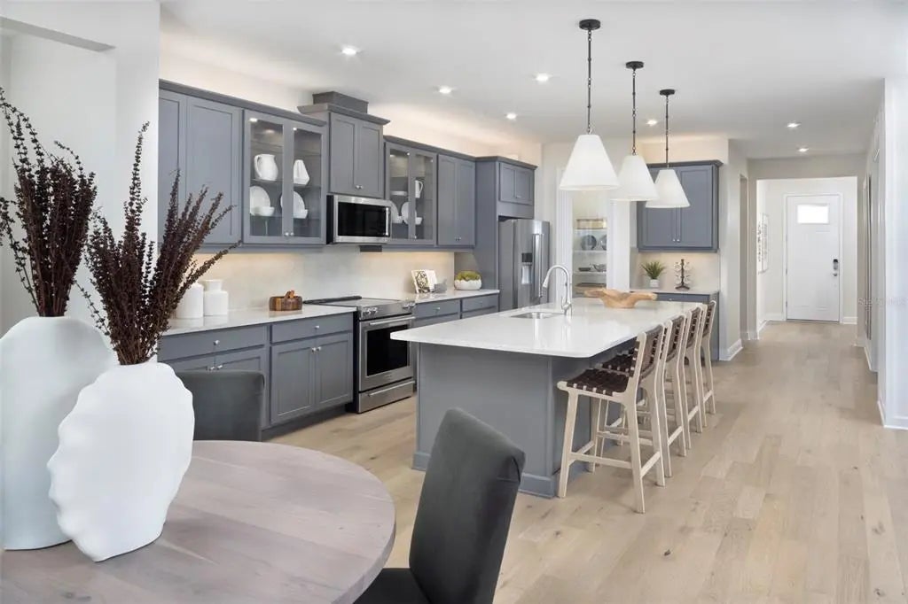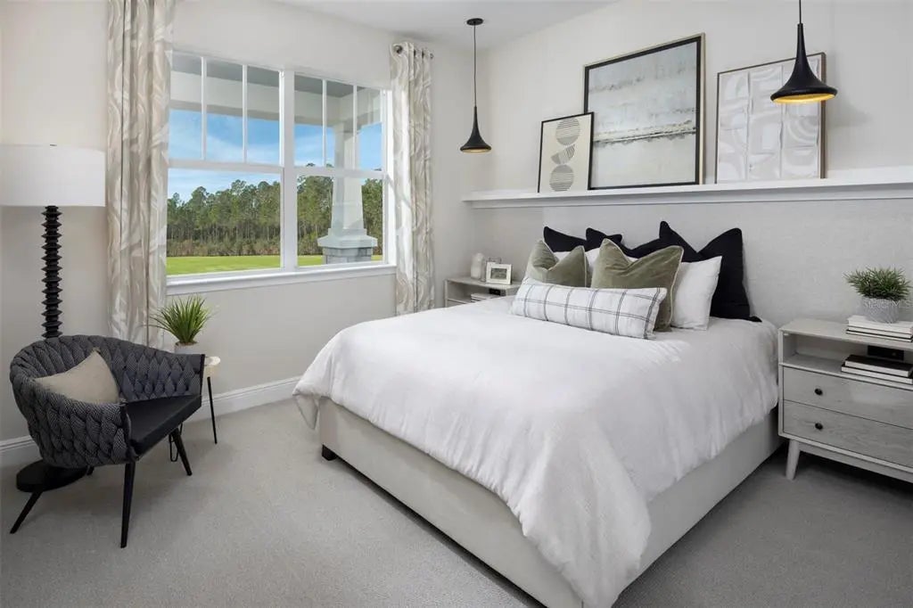 Step into the Merigold, a beautifully finished single-family home where sunlit rooms, flowing open spaces, and refined details create an atmosphere that feels both inviting and effortlessly polished. This thoughtfully planned layout offers 2 bedrooms, 2 baths, a study, and a spacious 2-car garage, paired with the warm curb appeal of the Craftsman elevation. Inside, the main living areas are dressed in large-format wood-look tile laid in an elegant staggered pattern, lending the home a clean, natural foundation that’s both stylish and easy to maintain. The kitchen features soft gray cabinetry with crown molding, crisp white quartz countertops, a generous island, and a stacked tile backsplash that adds subtle texture. The owner’s suite includes a relaxing bedroom, a large walk-in closet, dual sinks, and a beautifully tiled walk-in shower with floor-to-ceiling tile. The second bathroom boasts an upgraded recessed shower with fresh, bright tilework. Soft neutral-tone carpet warms both bedrooms, while the study continues the same handsome tile as the main living areas. Impact-rated windows provide added peace of mind and year-round comfort. Additional highlights include 8' interior doors, brushed-nickel finishes, an included washer and dryer, and a screened lanai with paver flooring for enjoying breezy mornings and peaceful evenings. Residents enjoy an impressive 11-acre amenity campus with a resort-style pool, lap pool, spa, fitness studios, pickleball and bocce courts, gathering lawns, lakeside seating, plus a lively dining and social scene at the Bright Bar and Daily Drip café. All of this is located just minutes from Downtown Wellen’s waterfront restaurants, events, and boutiques, as well as Gulf beaches known for soft white sand and glowing sunsets, with access to miles of trails that wind throughout the Wellen Park community. ***Photos, renderings and plans are for illustrative purposes only and should never be relied upon and may vary from the actual home. Pricing, dimensions and features can change at any time without notice or obligation. The photos may be from a furnished model home and not the home offered for sale.