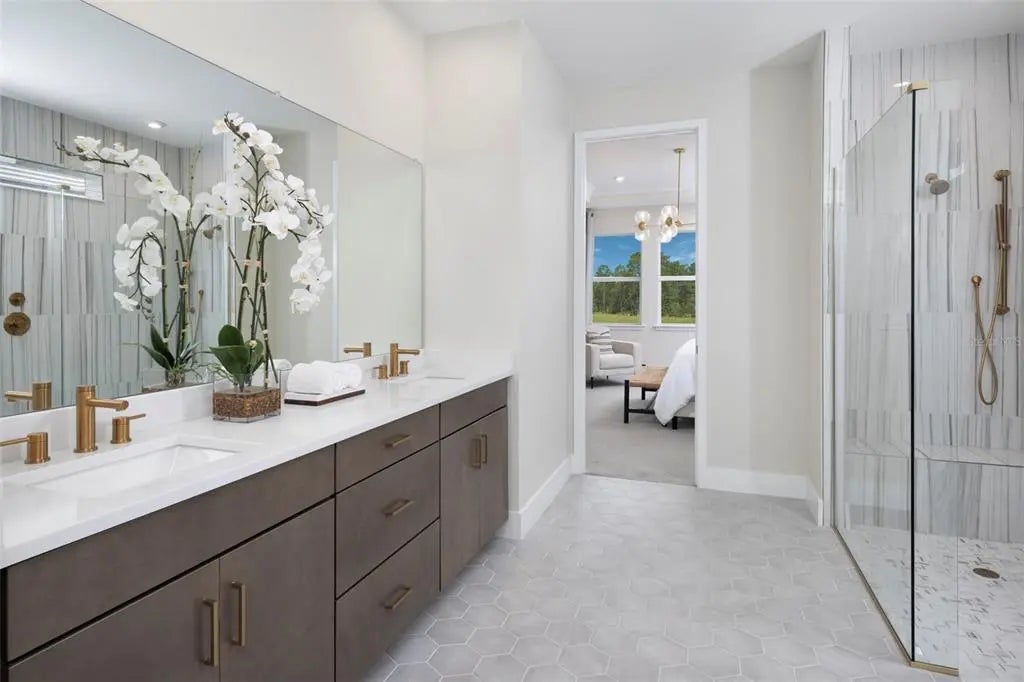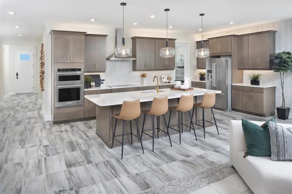Discover the Terra Rosa, a beautifully balanced home designed for comfort, style, and the vibrant lifestyle offered within Brightmore, an exclusive 55+ community. This thoughtfully crafted floorplan features 3 bedrooms, 3 baths, a study, and a 3-car garage, wrapped in inviting architectural charm and warm interior finishes. Wide-plank luxury vinyl flooring with a soft, natural wood look flows through the main living areas, while the bedrooms feature plush neutral carpeting and the bathrooms are finished in elegant stone-inspired tile. The executive kitchen blends rich, warm cabinetry accented with crown molding, smooth white quartz countertops, a generous island, stainless Whirlpool appliances, and a textured stacked backsplash that adds a clean, modern touch. The owner’s suite feels like a private retreat with its spacious walk-in closet, dual sinks, and a beautifully tiled walk-in shower that extends to the ceiling for a spa-like effect. Two additional bathrooms are thoughtfully designed with coordinated tilework, including an upgraded recessed shower in the main guest bath. The study offers a quiet, flexible space, and the laundry room comes complete with a washer and dryer for added convenience. A screened lanai with paver flooring creates the perfect setting for morning coffee or sunset relaxation. Living in Brightmore means enjoying a full 11-acre amenity experience—featuring a resort-style pool, lap pool, spa, fitness studios, pickleball and bocce courts, gathering lawns, lakeside seating, and a lively social scene at the Bright Bar and Daily Drip café. All of this is just minutes from Downtown Wellen’s waterfront dining, entertainment, and events, plus easy access to sun-soaked Gulf beaches and miles of scenic walking and biking trails throughout Wellen Park. This is relaxed 55+ living at its finest.