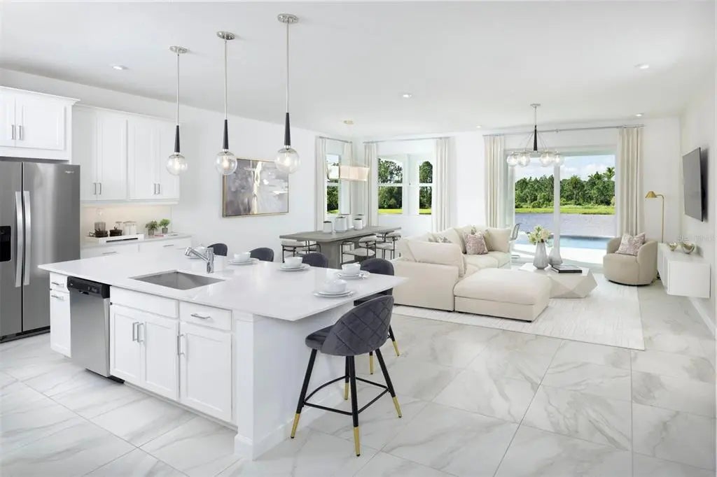 Welcome to this beautifully upgraded 3-bedroom, 2 and a half bathroom Gateway home with a versatile flex room and a 2-car garage in the Lakeside enclave of Sunstone, where thoughtful design and inviting style come together to create a haven made for relaxed Florida living. Sunlight pours through the open layout, illuminating the elegant 12x24 plank-style tile in soft stone-washed shades arranged in a modern staggered pattern that flows seamlessly through the main living spaces. The kitchen stands out with linen-painted cabinetry topped with striking soapstone-inspired quartz, highlighted by a sleek linear-pattern backsplash that adds just the right touch of texture and contemporary flair. A versatile flex room offers the perfect space for work or hobbies, while the serene primary suite features a generous walk-in closet and a spa-like bathroom with floor-to-ceiling tile, brushed-nickel finishes, and a frameless shower enclosure for a truly elevated retreat. This home also includes whole-house impact-resistant glass for added comfort and peace of mind. Step outside to the covered paver lanai—an ideal place to unwind and soak in the breezy Lakeside atmosphere. As part of Sunstone’s vibrant master-planned setting, residents enjoy access to two exceptional amenity campuses, each offering its own resort-style experience, including lakefront clubhouses with welcoming social spaces, sparkling resort pools with lap lanes, state-of-the-art fitness centers, game rooms, pickleball courts, outdoor group fitness areas, paw parks, event lawns, and a full calendar of activities led by a dedicated Lifestyle Director. All of this is just minutes from waterfront dining, shopping, trails, and entertainment—making this home an inviting retreat at the heart of a community where every day feels like a getaway. ***Photos, renderings and plans are for illustrative purposes only and should never be relied upon and may vary from the actual home. Pricing, dimensions and features can change at any time without notice or obligation. The photos may be from a furnished model home and not the home offered for sale.