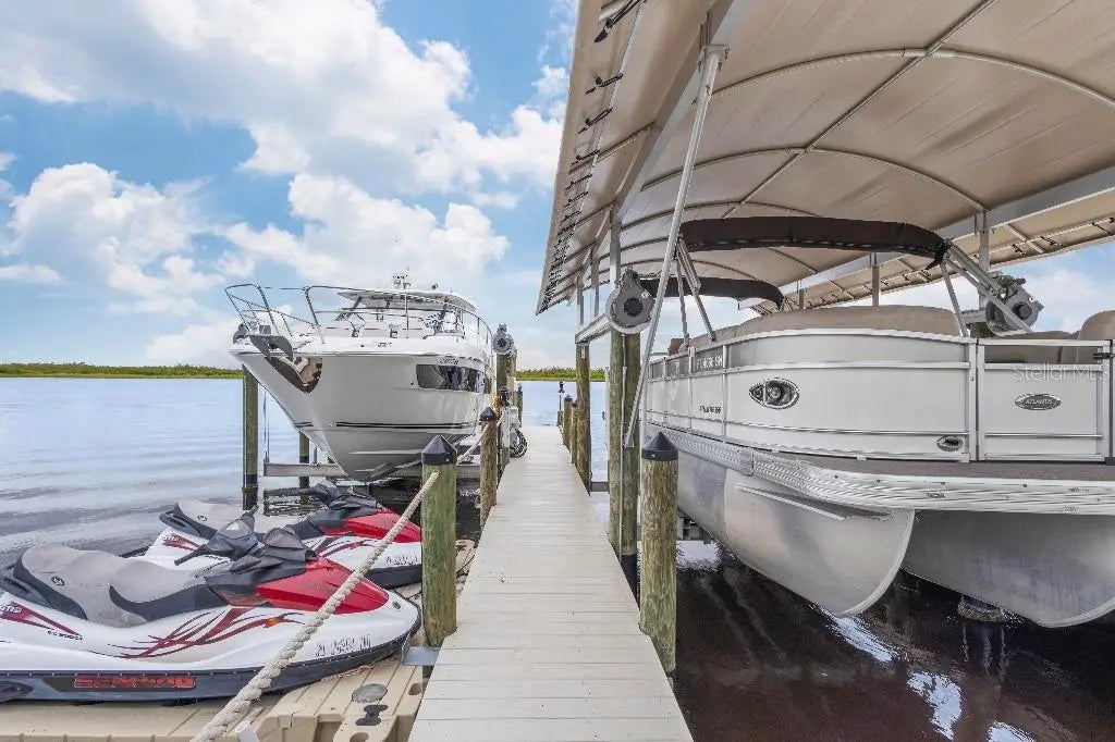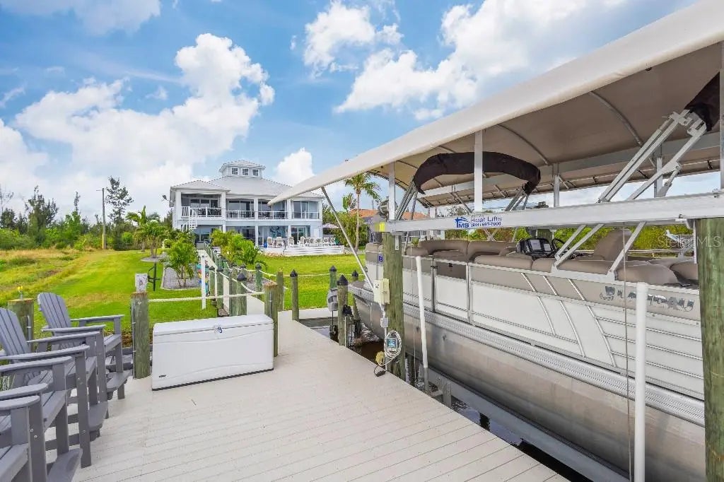 PRIME LOCATION! Presenting this stunning, Key West Style, waterfront home on the desired Lagoon in South Gulf Cove, located minutes from Charlotte Harbor. The front staircase leads to a covered balcony with w/ Wi-Fi lighting and sound. The main entry doors have a retractable screen so you can open the doors to enjoy the perfect day bug free! Have groceries? Take the elevator! Step into the great room ahead with 20 ft of stacking sliders giving you an expansive view of the Lagoon and the preserve to relax and watch wildlife, sailboats and the stunning sunrises. The custom-built entertainment wall boasts a tv niche large enough for an 82” tv, and shadow boxes to display your taste of style. On those rare cold nights, snuggle up with the electric fireplace and turn on the surround sound for an epic movie night. The kitchen is highlighted with quartz countertops, subway tile backsplash featuring an oversized counter height island, cabinetry with under cabinet lights, 2 separate sinks, Frigidaire Professional appliances; cooktop, double wall ovens, standup refrigerator and standup freezer with trim kit, microwave/air fryer, and 2 dishwashers. Also, a full-sized wine fridge and a walk-in pantry. With an adjacent built-in exterior bar area and access to the balcony through stacking sliders, hosting game day is a breeze with the outdoor bar with cabinets, granite countertops, equipped with tv’s, beverage coolers, and ice maker. The retractable motorized screens allow for either clear views or insect protection, depending on the time of day. The upper level boasts 2 separate en suites with walk-in closets, one with a walk-in shower, the other with a tub/shower. The 3rd guest room provides enough space for a King bed and walk-in closet and a privately shared bathroom. The primary en suite offers separate walk-in closets, separate vanities, walk-in shower, and private water closet. Also utilize a half-walled space used for your liking. The lower level provides additional rooms with mini split ac’s, one is used as a gym with sauna and the other room is equipped with kitchen amenities, closet and enough room for a bed and furniture along with an attached full pool bath. With the lower levels generous size, there is an interior breezeway with access to the pool and garages, and equipped with water hookup. Along with a storage area under the interior staircase, there is a large separate storage room on this level. The lanai consists of a Pebble Tec saltwater pool, a heater and an easy-to-use Wi-Fi control system. Enjoy a built-in bench, a sun shelf, a relaxing spa with waterfall, and Travertine decking. Take a break from the pool, have a seat at the bar or in the covered lounge area and enjoy the peaceful sounds of the water fountain wall. A Control 4 sound system is installed throughout the home as well as the beautifully landscaped yard with palm trees and a sandy beach area overlooking the Lagoon. If boating is more your style, then stroll down to the private dock with 3 lifts; an 8k lb covered boat lift, a 25k lb boat lift and a manual lift for a small boat. Other amenities include an AI Security Camera system, a 400-amp service, hook up for backup generator, 3 zone ac system, PGT insulated low-e impact glass, HardiBoard siding, standing seam metal roof, spray foam insulation, hot water recirculation system, and a bug system. Whether you want to explore the scenic canals or boat to dinner or sail into the Gulf, the possibilities are endless!
